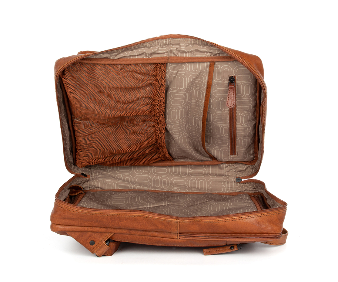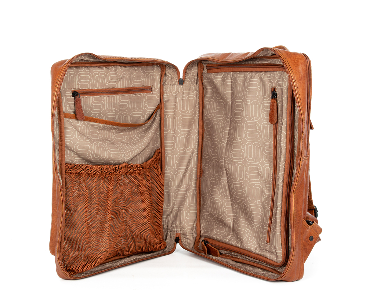 Tento kožený batoh vyrobený z prémiových materiálů je nezbytným partˇákem každého cestovatele, jeho velikost spadá do rozměrů 40 x 30 x 20 cm. která je povolena (téměř) všemi leteckými společnostmi. Batoh má prostor na všechno oblečení a nezbytnosti, které potřebujete, a udrží vaše oblečení bez vrásek. Samozřejmě se může pochlubit také samostatnou polstrovanou přihrádkou na papíry nebo váš notebook až do velikosti 15,6″. Dodává se také s pláštěnkou, která ochrání vaše věci v dešti.