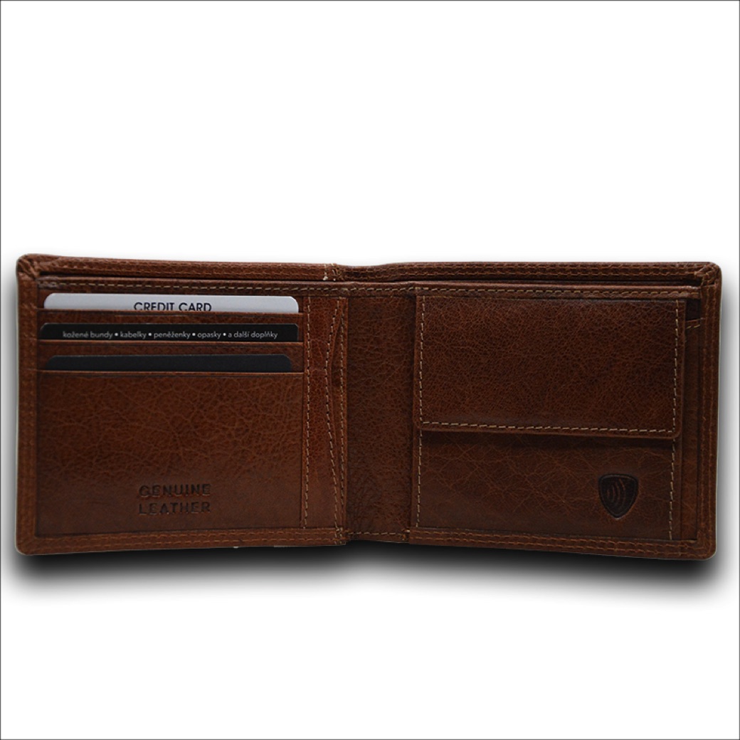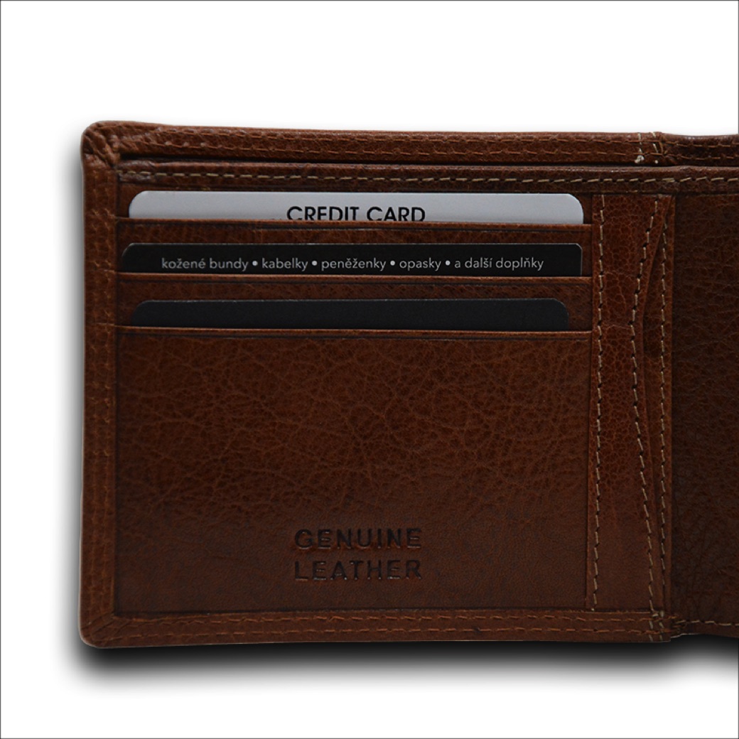 Tato pánská kožená peněženka je vyrobena ze 100%hovězí lícové kůže. RFID ochrana, kvalitní lícová kůže, 2 přihrádky na standardní české bankovky, kapsička na mince, 3 přihrádky na karty, 2 vnitřní přihrádky, do přihrádky vložíte i malý technický průkaz, kvalitní podšívka, nitě, druky. Peněženka je zabalena v dárkové krabičce.