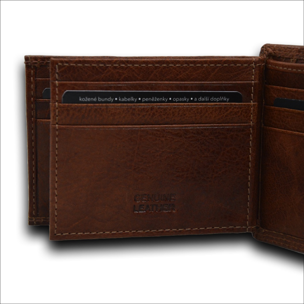 RFID ochrana, kvalitní lícová kůže,2 přihrádky na bankovky, kapsička na mince, 9 přihrádek na karty, 2 vnitřní přihrádky, 2 vnitřní přihrádky se slídou, 2 vnitřní kapsy na zip, do peněženky lze umístit malý technický průkaz, kvalitní podšívka, nitě, druky. Peněženka je zabalena v dárkové krabičce.