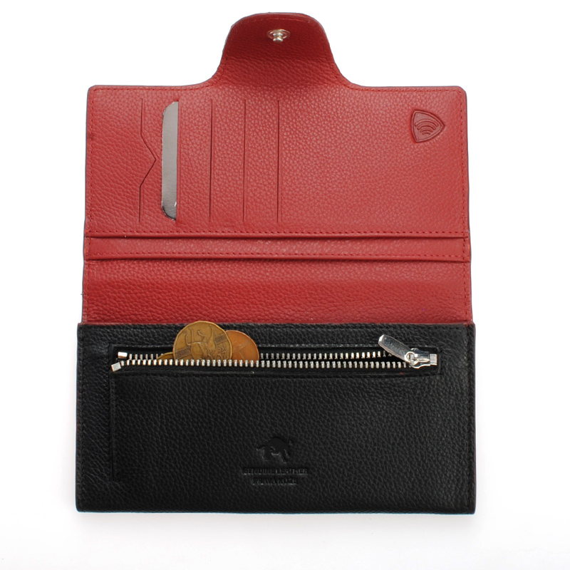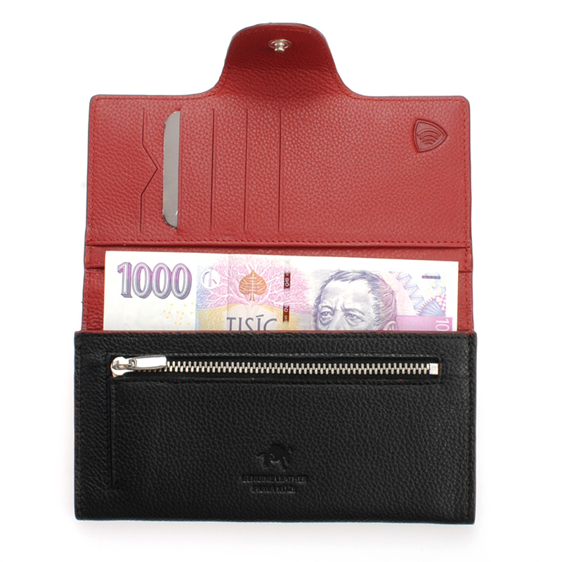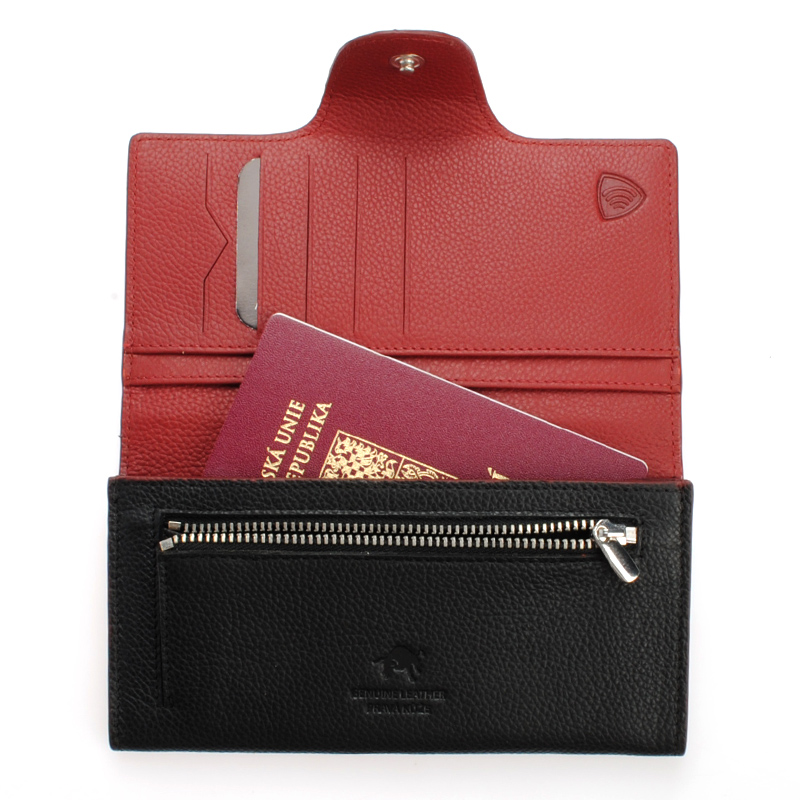 Tato dámská kožená peněženka je vyrobena ze 100%hovězí lícové kůže. RFID ochrana, kvalitní lícová kůže, 4 přihrádky na bankovky, kapsička na mince, 8 přihrádek na karty, kvalitní podšívka, nitě, druky. Do této peněženky se vejde i Váš cestovní pas.