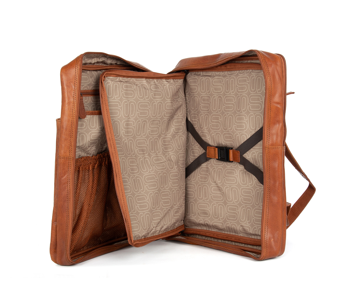 Tento kožený batoh vyrobený z prémiových materiálů je nezbytným partˇákem každého cestovatele, jeho velikost spadá do rozměrů 40 x 30 x 20 cm. která je povolena (téměř) všemi leteckými společnostmi. Batoh má prostor na všechno oblečení a nezbytnosti, které potřebujete, a udrží vaše oblečení bez vrásek. Samozřejmě se může pochlubit také samostatnou polstrovanou přihrádkou na papíry nebo váš notebook až do velikosti 15,6″. Dodává se také s pláštěnkou, která ochrání vaše věci v dešti.