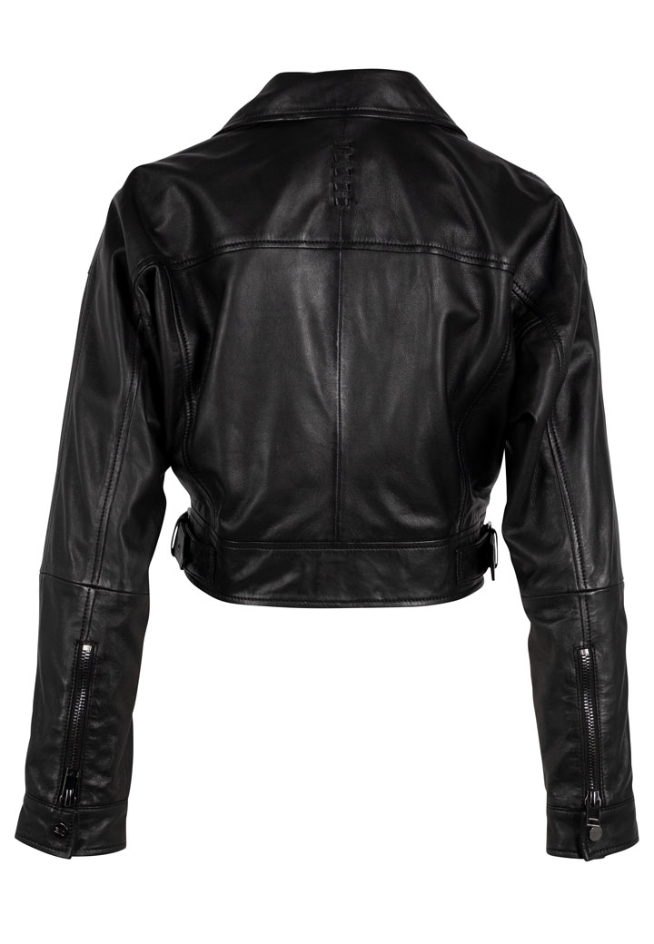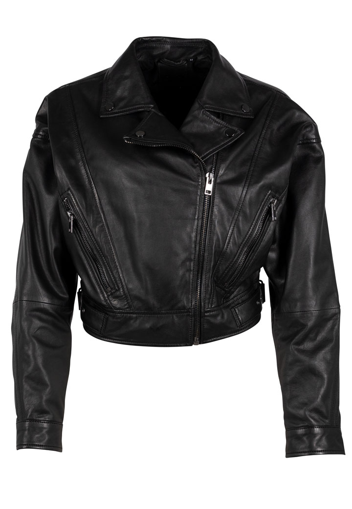Dámský krátký kožený křivák v černé barvě vyrobený ze 100% jehnětiny ve střihu Over Size. V kontextu módy se jedná o styl, kde oblečení je navrženo tak, aby bylo volné a prostorné. Mnohdy to zahrnuje širší střihy, delší rukávy či prodloužené délky.