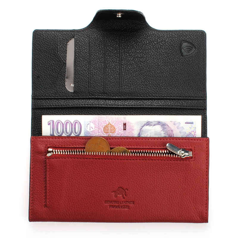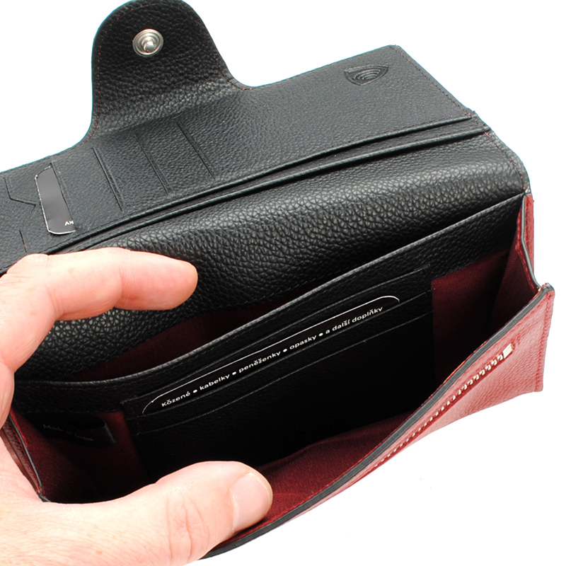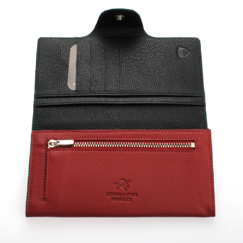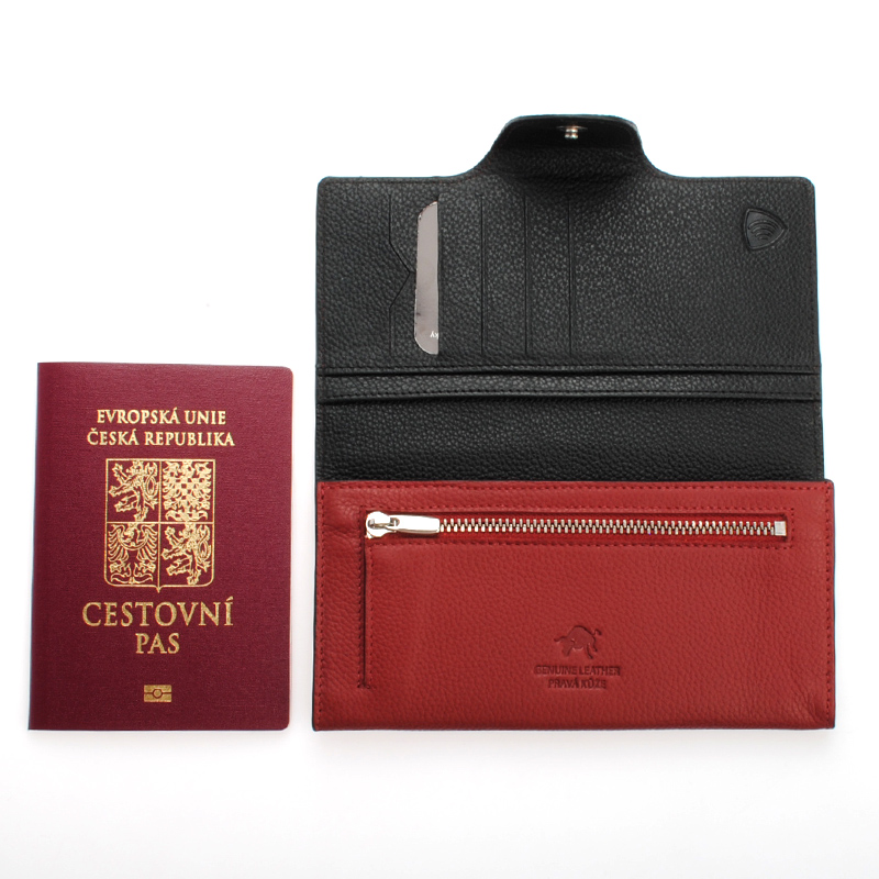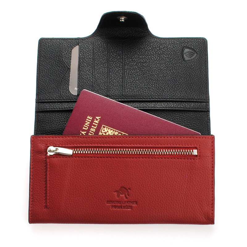 Tato dámská kožená peněženka je vyrobena ze 100%hovězí lícové kůže. RFID ochrana, kvalitní lícová kůže, 4 přihrádky na bankovky, kapsička na mince, 8 přihrádek na karty, kvalitní podšívka, nitě, druky. Do této peněženky se vejde i Váš cestovní pas.