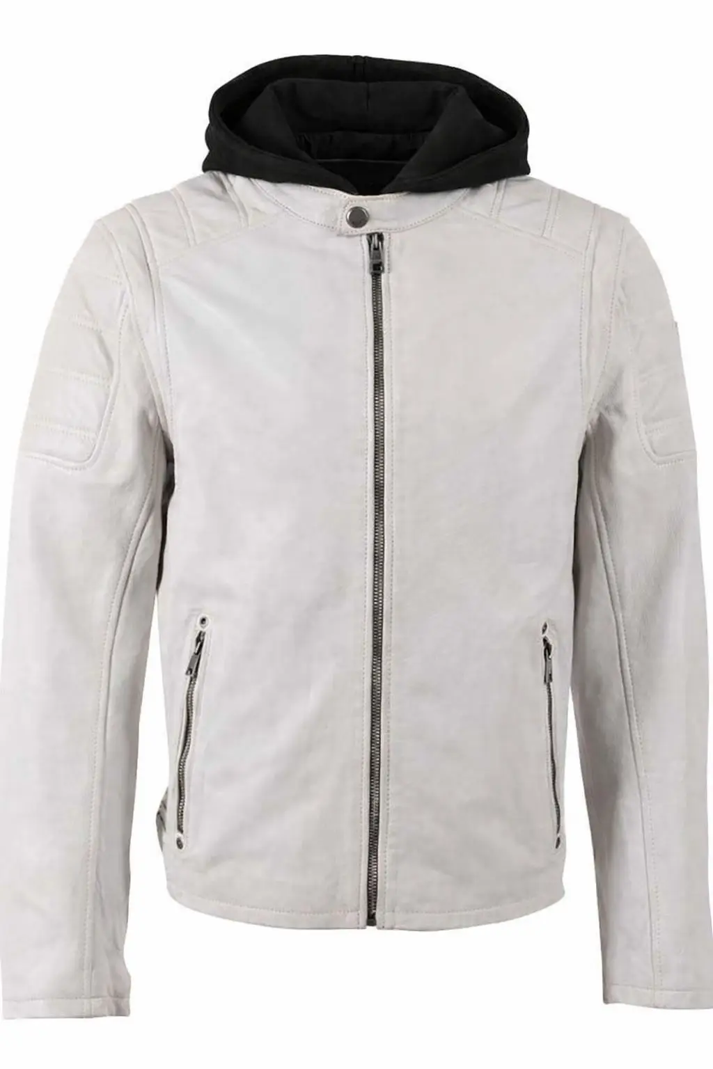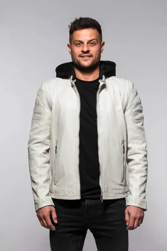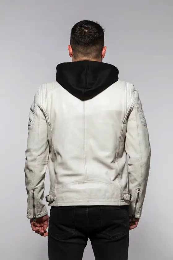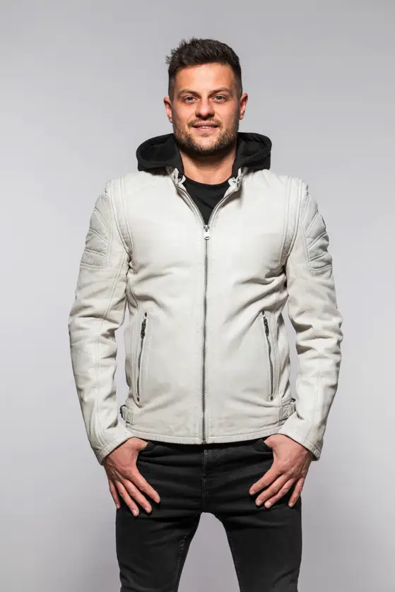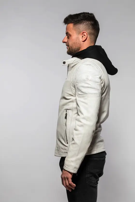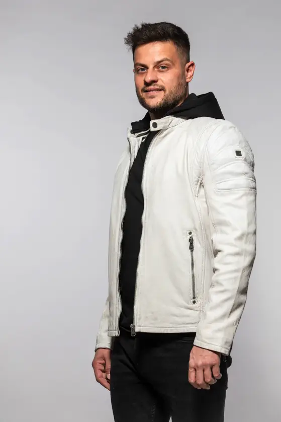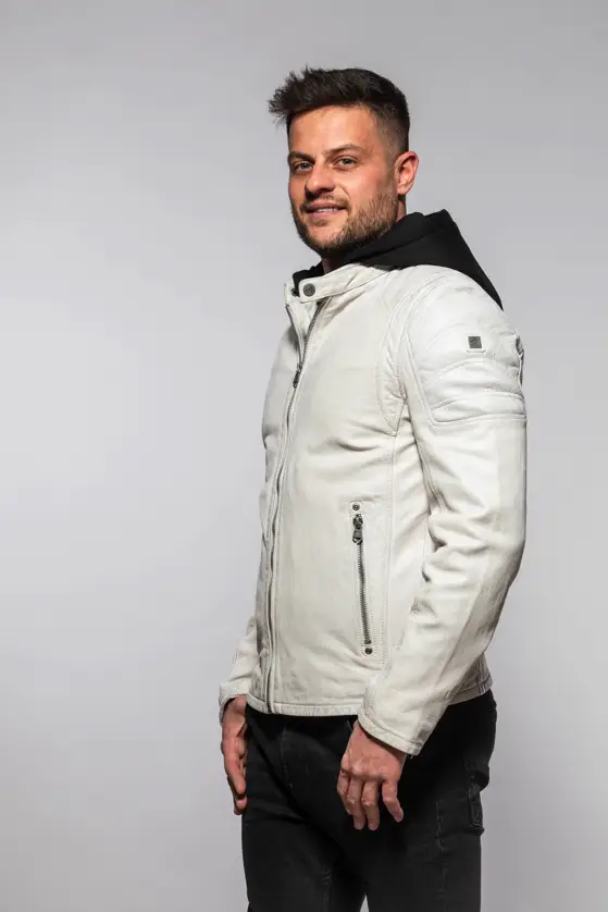 Dotaz k produktu - Bílá pánská kožená bunda s textilní kapucí MMRyxo DB OffWhite