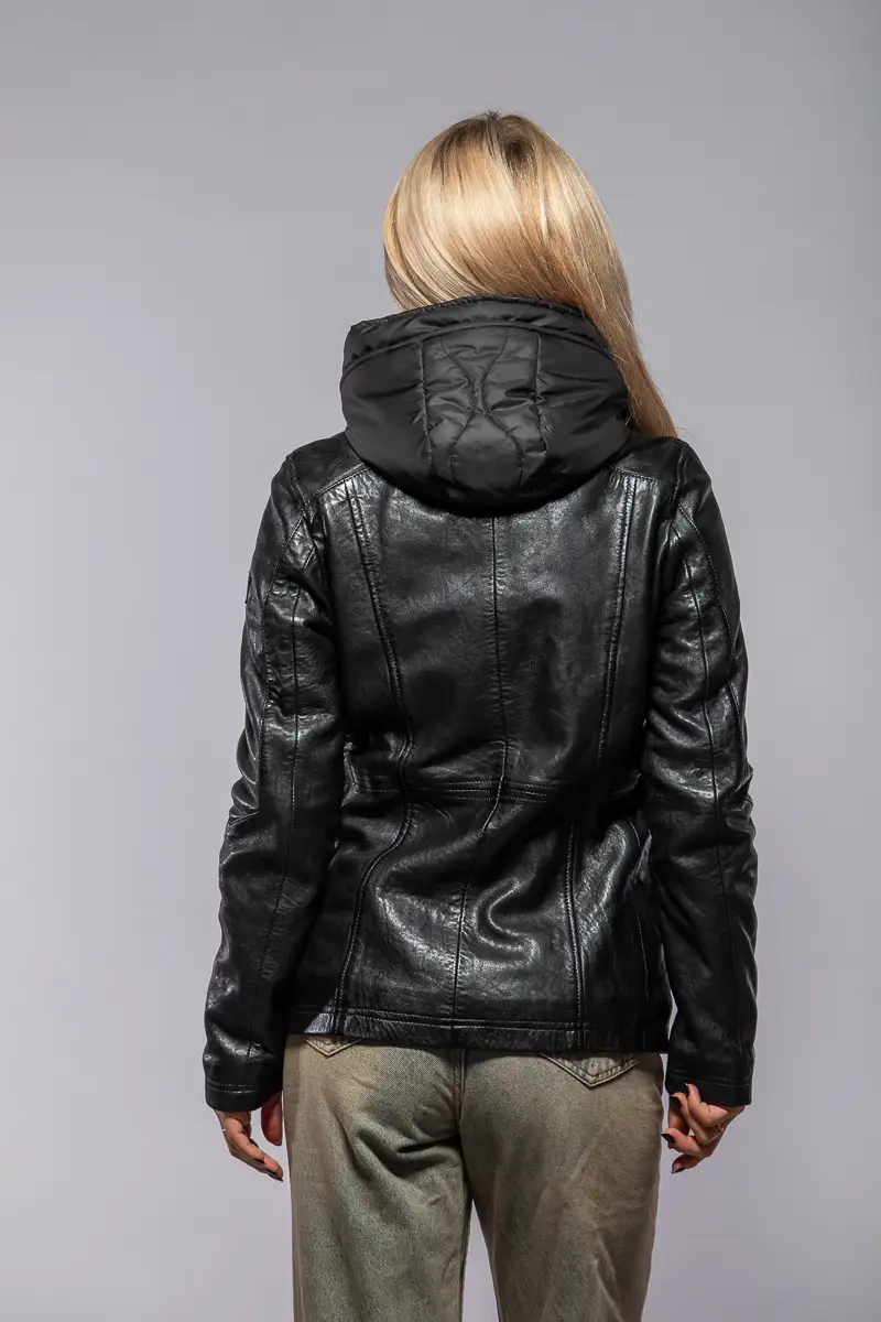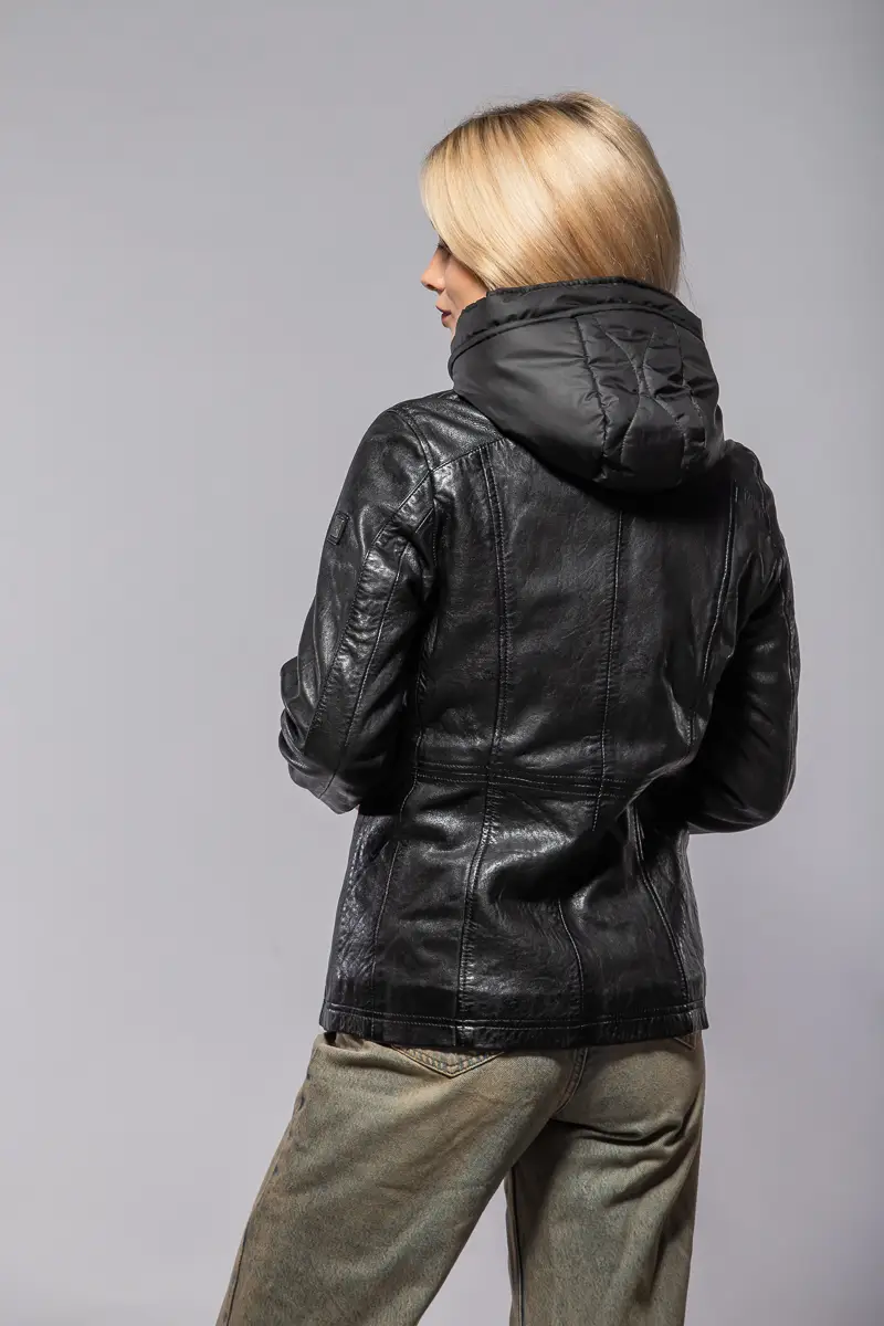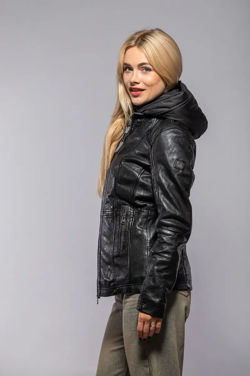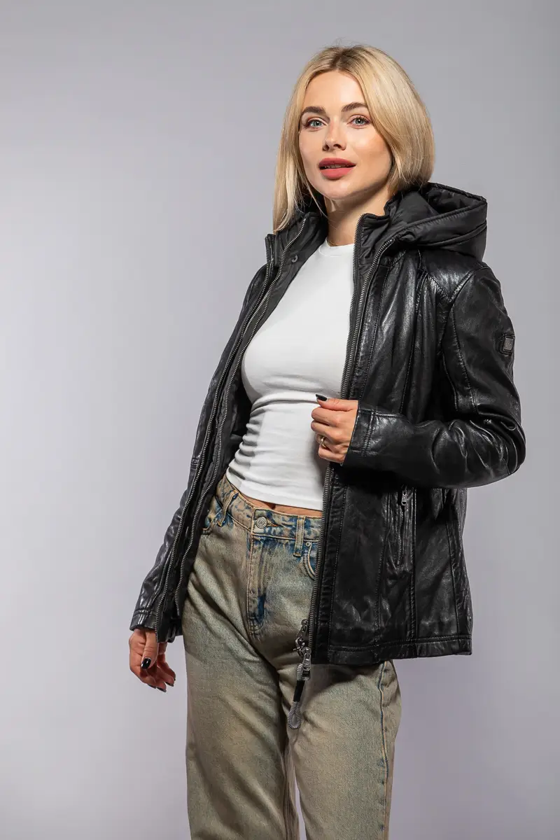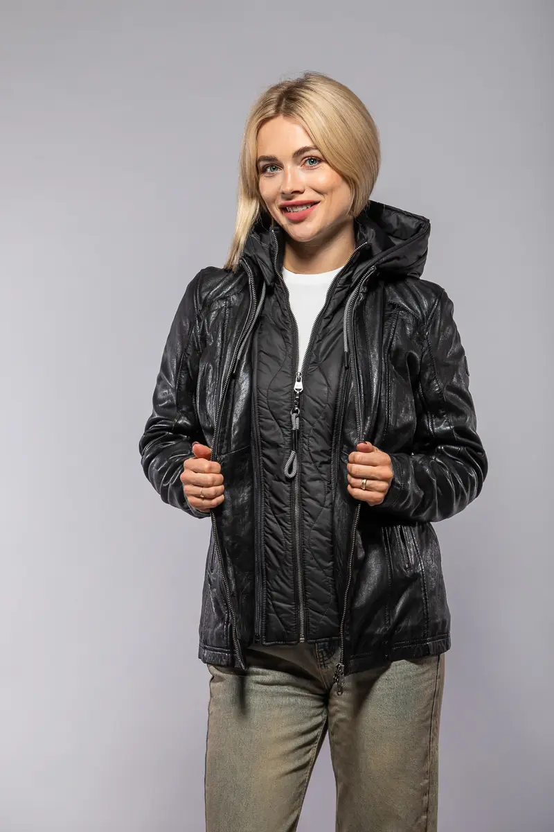 Dámská černá kožená bunda vyrobená ze 100% jehnětiny. Bunda má jemné zateplení, odnímatelnou kapuci (100% polyester) je vypasovaná v bocích s prodlouženou délkou (střih regular) . Jedná se náš originální výrobek Divoký býk z kvalitní lícové kůže.