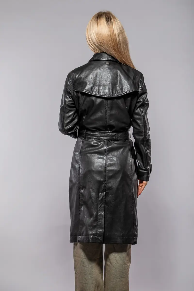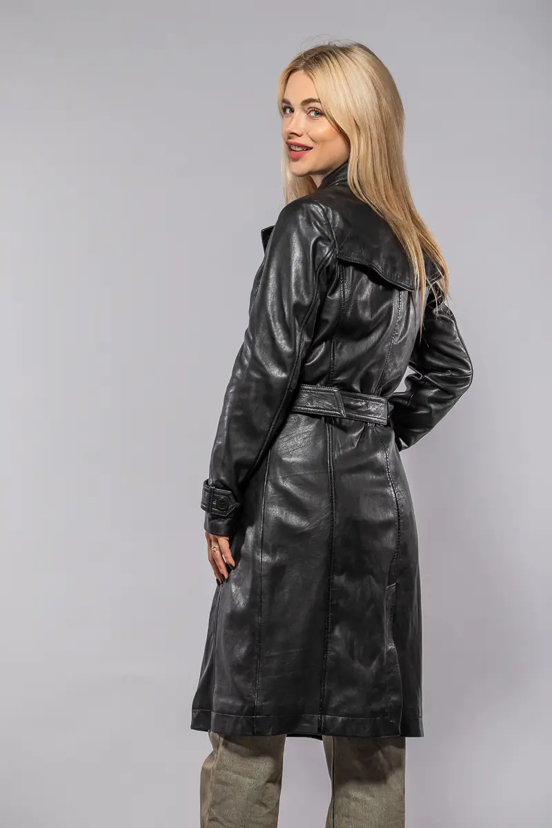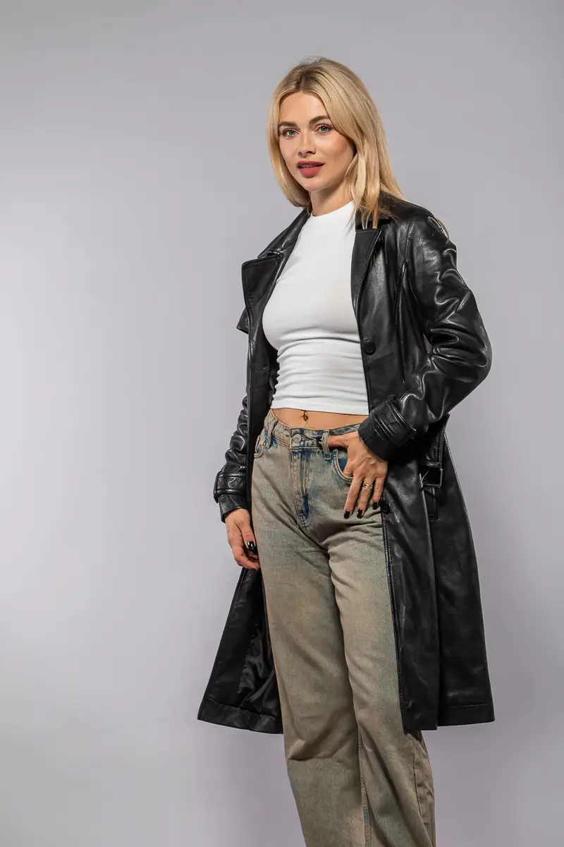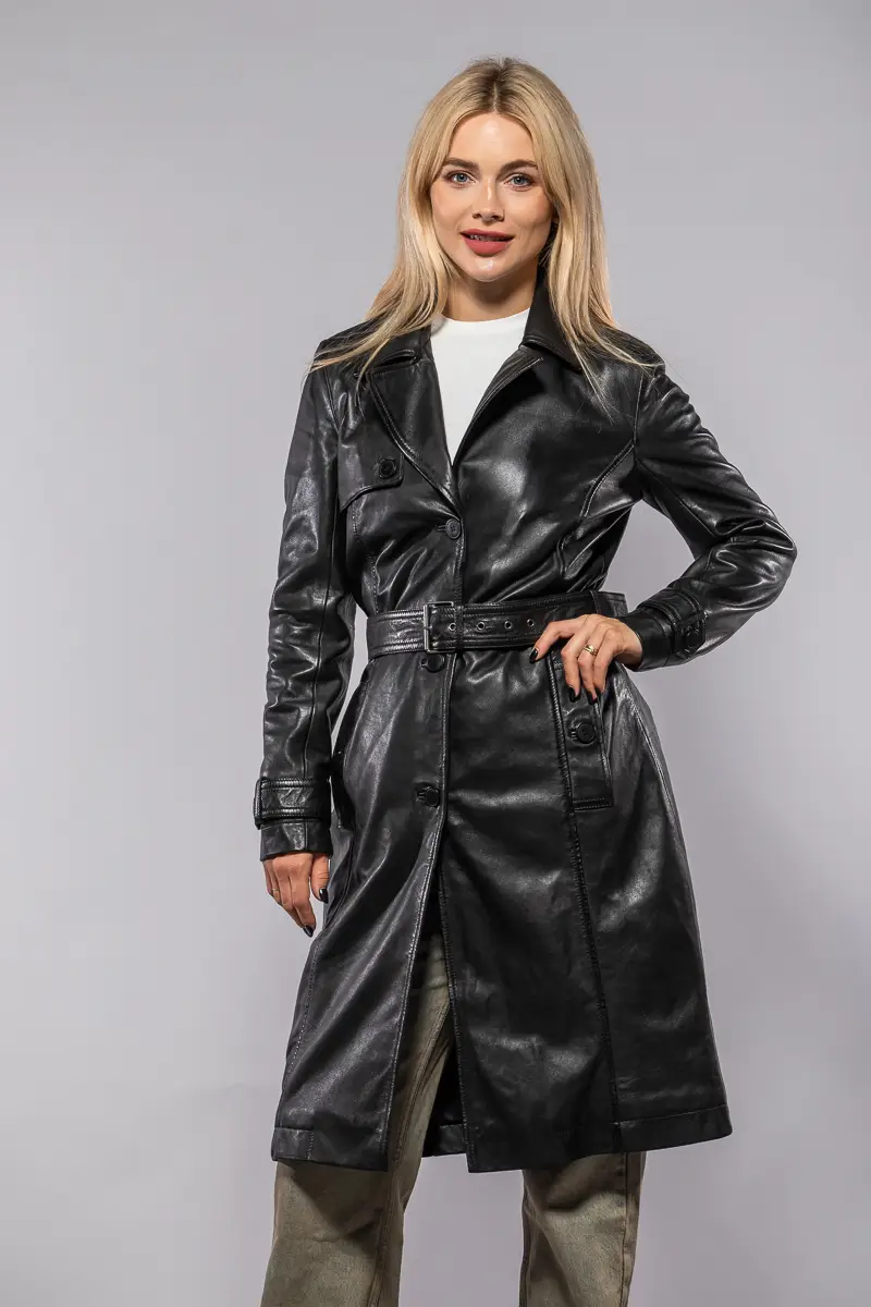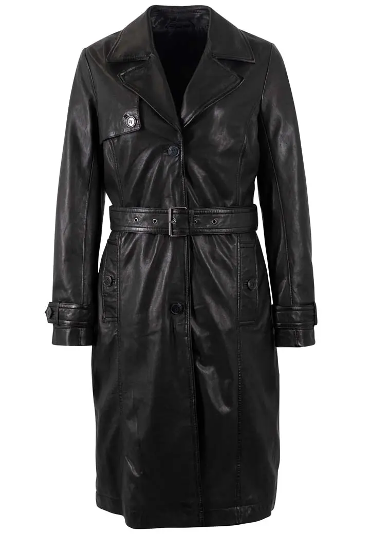 Dámský kožený kabát černé barvy z jehnětiny, rostlinně činěný, podšívka 100% polyester, střih regular fit. Zapínání je na knoflíky a opasek v pase. Na konci rukávů ozdobné pásky, boční kapsy s knoflíky a zadní rozparek. Vybíráte koženou bundu? U býka najdete ty nejlepší kožené bundy. Obrovský výběr modelů i barev, bundy máme i v nadměrných velikostech. Navštivte nás v některé z našich prodejen, které máme v Praze, Plzni a v Ostravě. Všechny kožené bundy máme skladem!