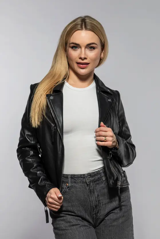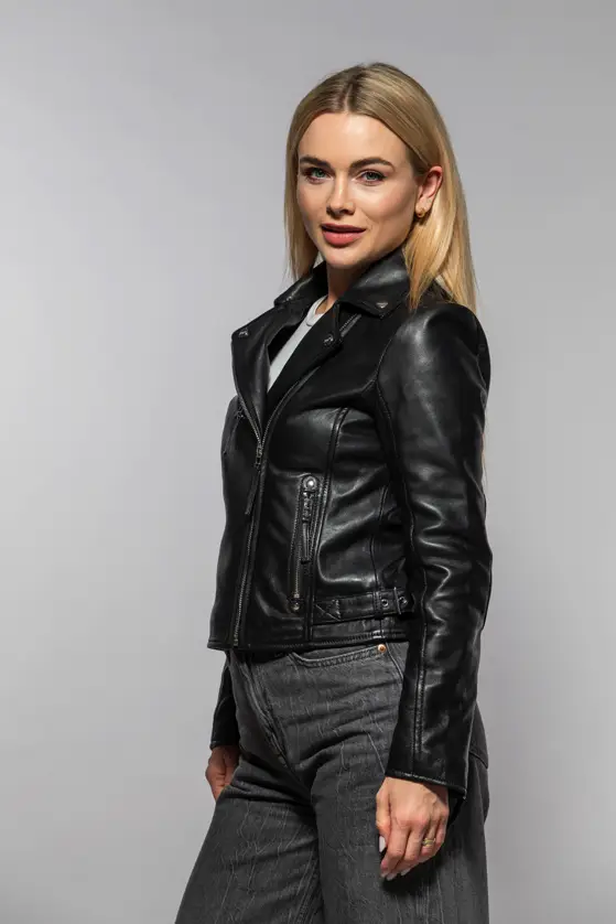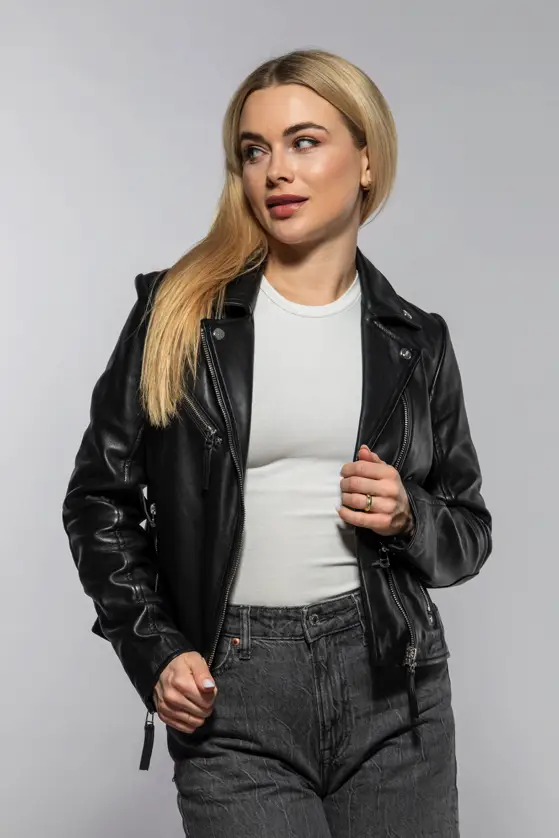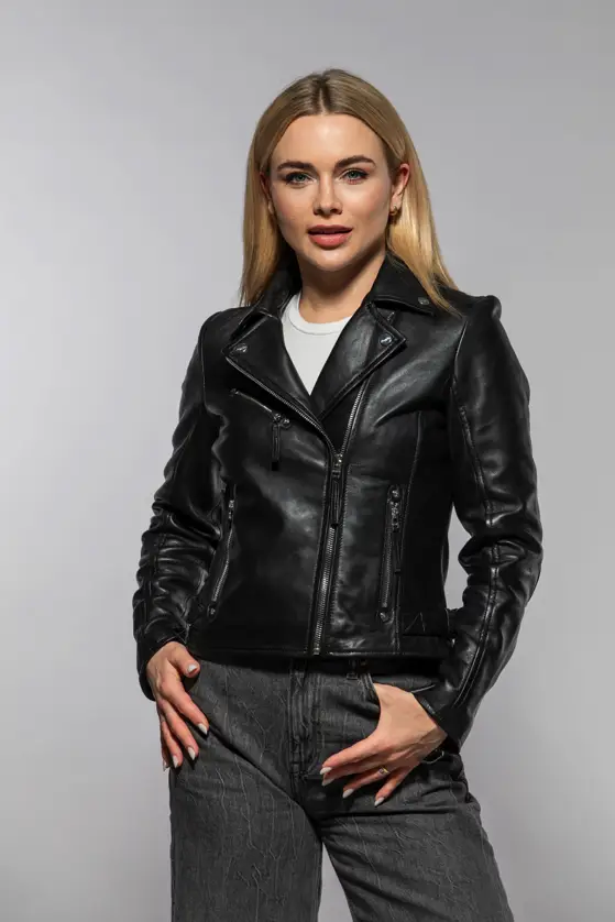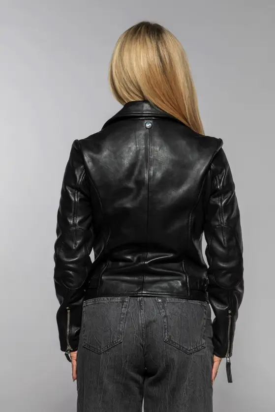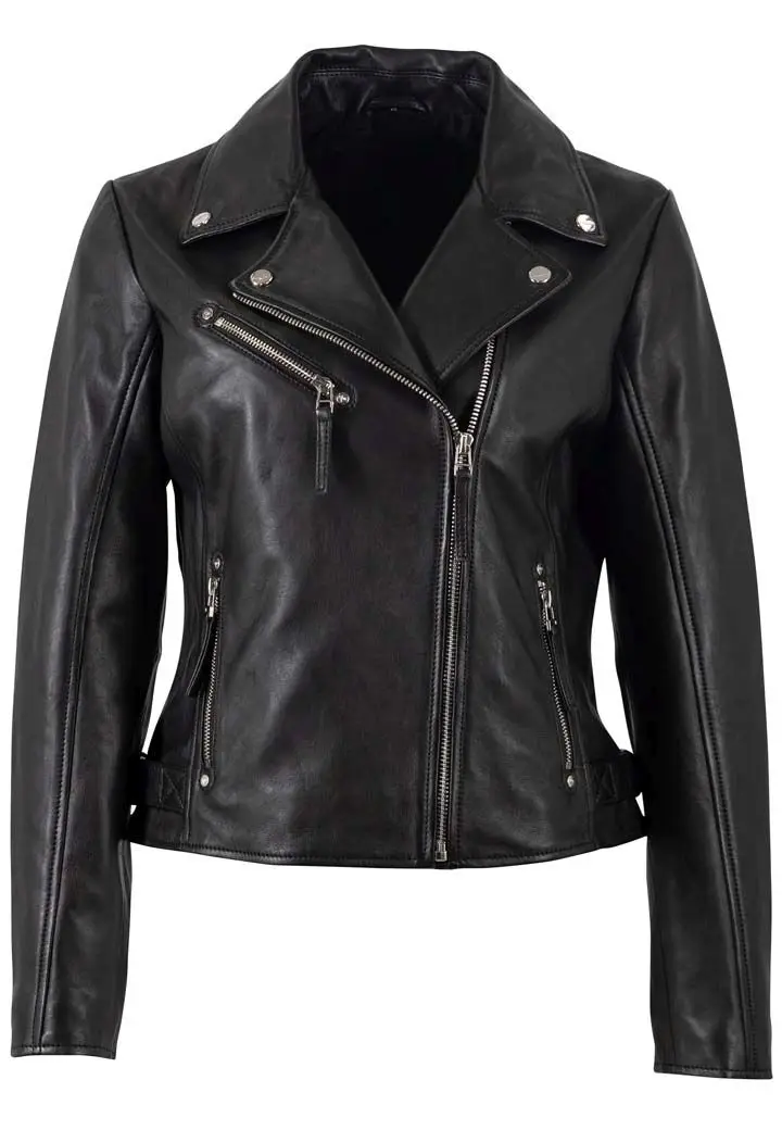 Dámský klasický kožený křivák v černé barvě střižený do pasu, vyrobený ze 100% jehnětiny se stříbrnými doplňky. Střih Regular-Fit pro běžné postavy.