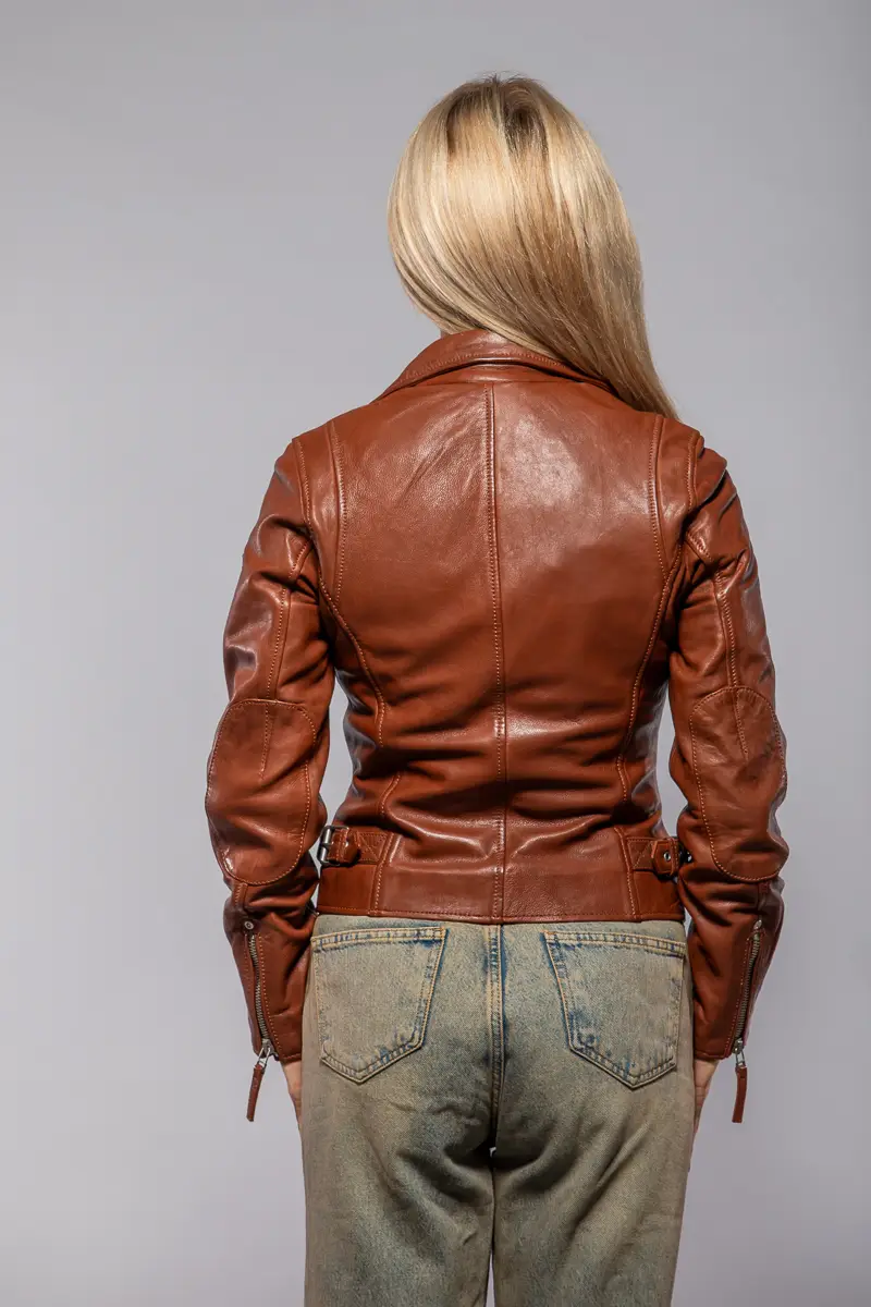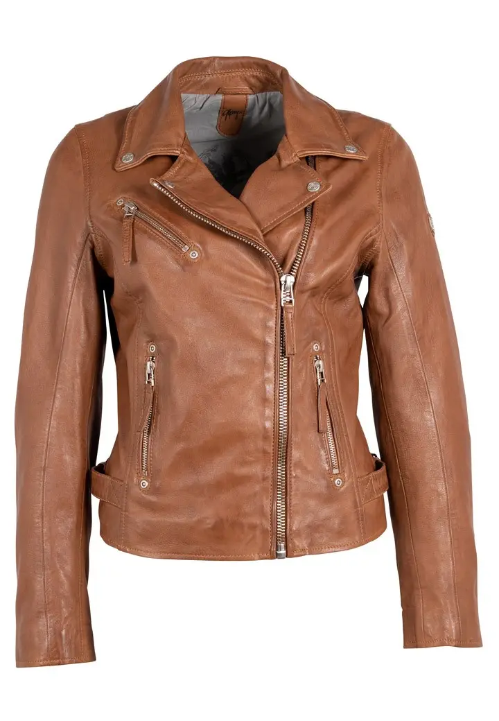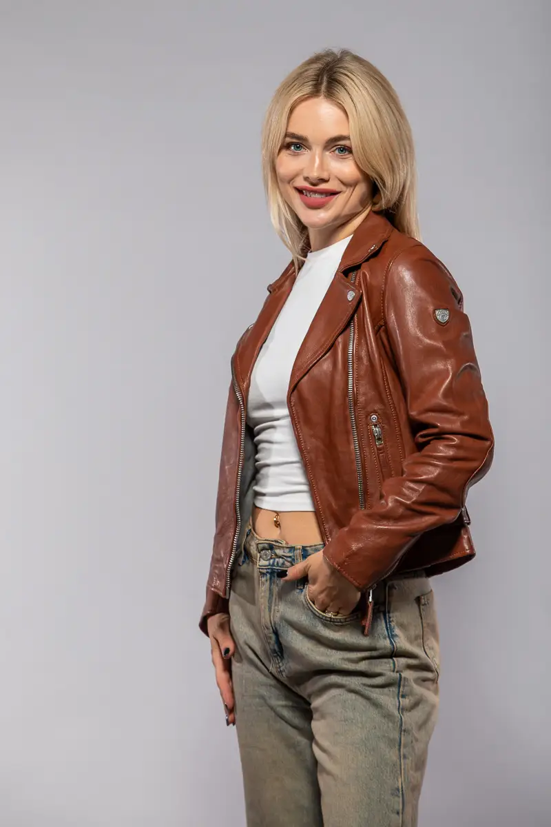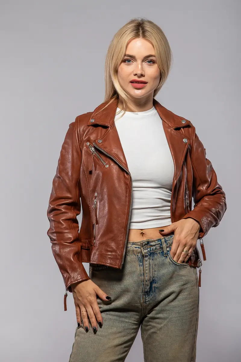 Dámský kožený křivák v koňakové barvě střižený do pasu, vyrobený ze 100% jehnětiny se stříbrnými doplňky. Vybíráte koženou bundu? U býka najdete kožené bundy předních evropských výrobců Gipsy a Derrcraft. Obrovský výběr modelů i barev, bundy máme i v nadměrných velikostech. Navštivte nás v některé z našich prodejen, které máme v Praze, Plzni a v Ostravě. Všechny kožené bundy máme skladem!