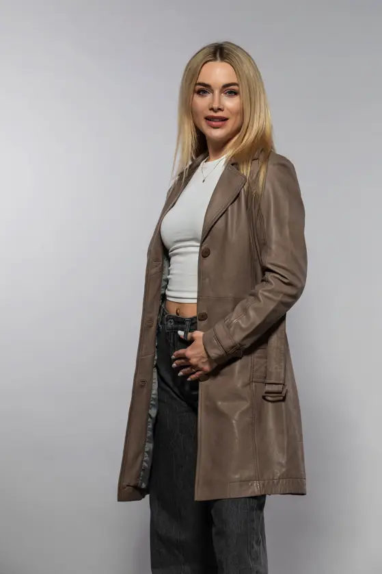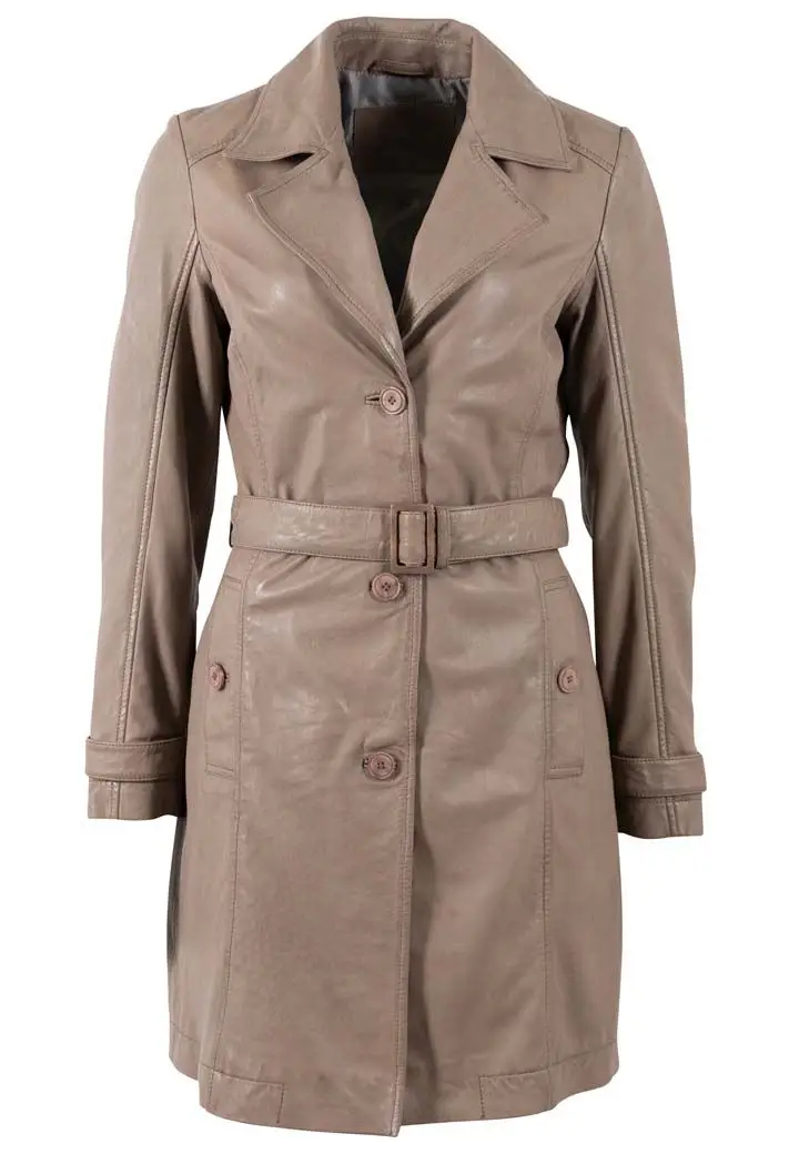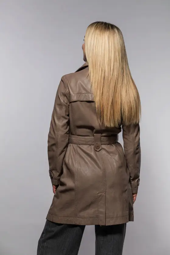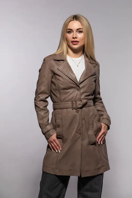 Dámský kožený kabát barvy elephant z jehnětiny, rostlině činěný, podšívka 100% polyester, střih regular. Zapínání je na knoflíky a opasek v pase. Na konci rukávů ozdobné pásky, boční kapsy s knoflíky a zadní rozparek.