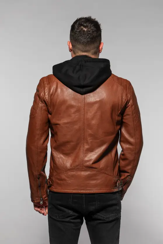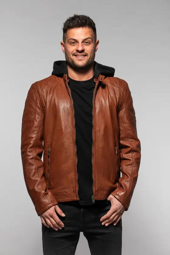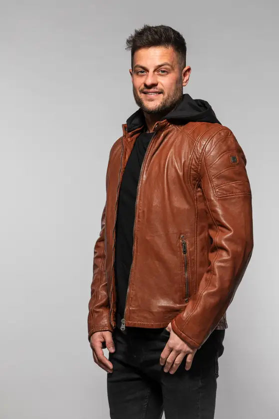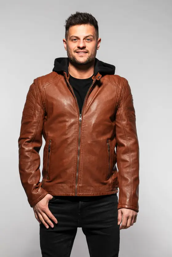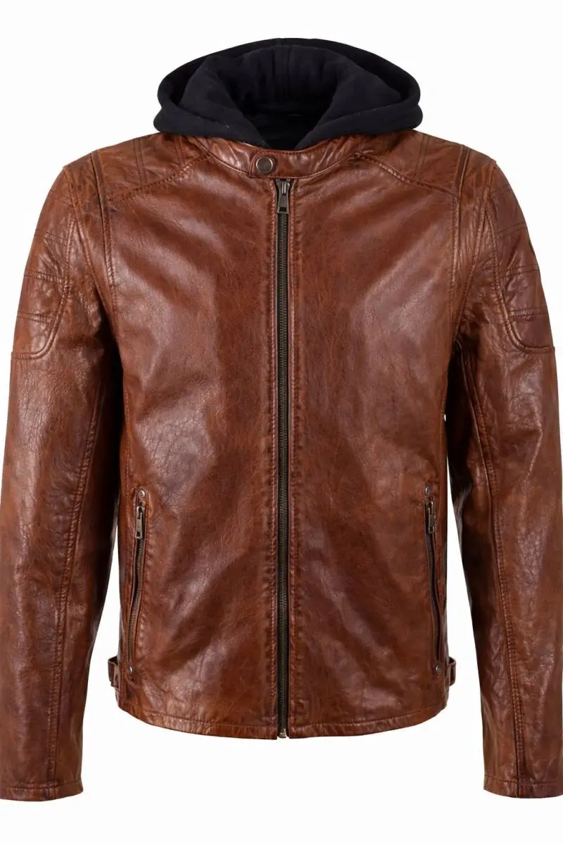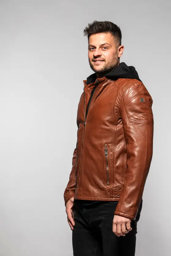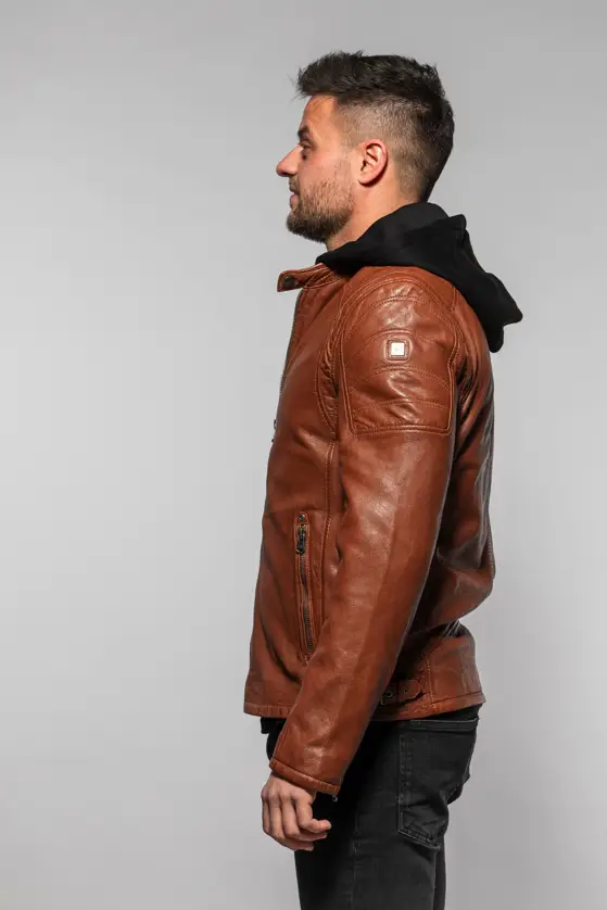 Dotaz k produktu - Koňaková pánská kožená bunda s textilní kapucí MMRyxo DB DCog