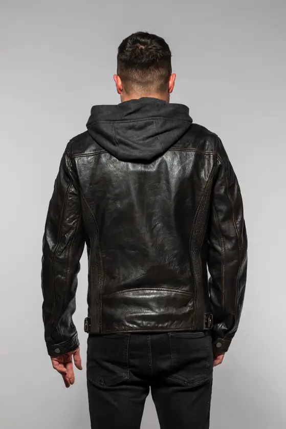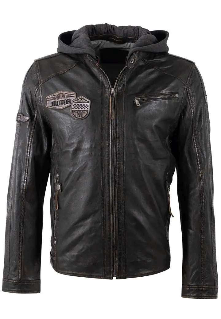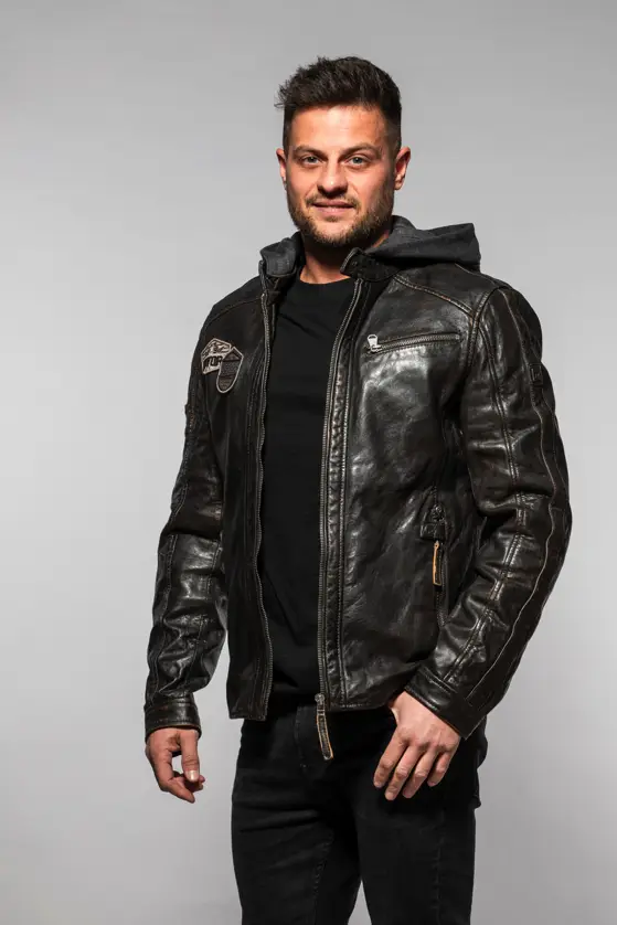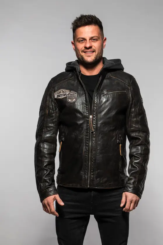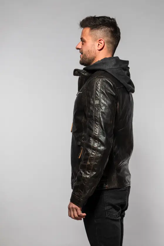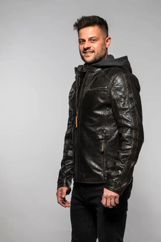 Pánská kožená bunda je vyrobena ze 100% jehnětiny a má odnímatelnou textilní kapuci. Střih pro běžné postavy (Regular-Fit) a dobře padne. Tato bunda je náš originální produkt z kvalitní lícové kůže a zpracováním.