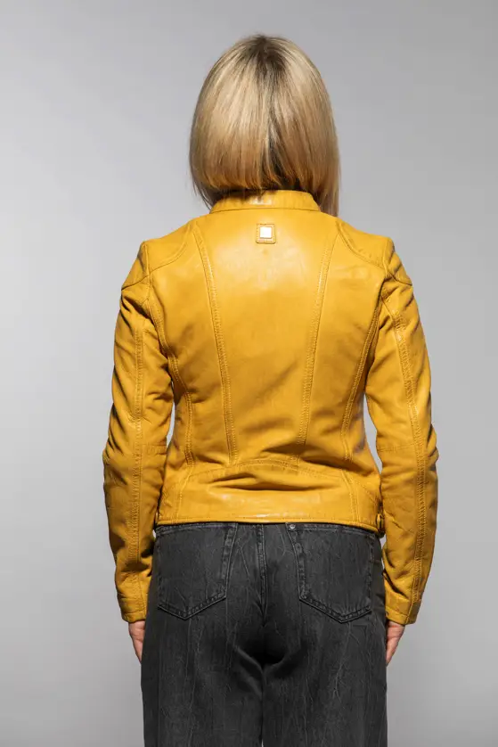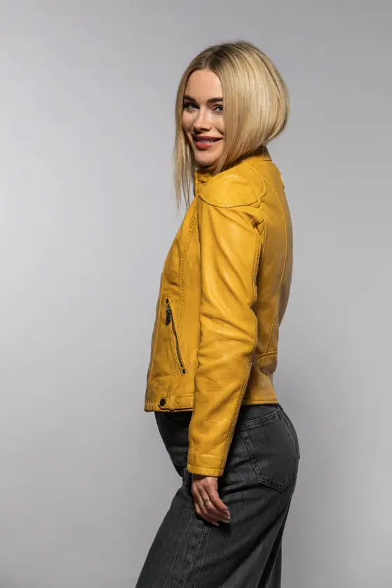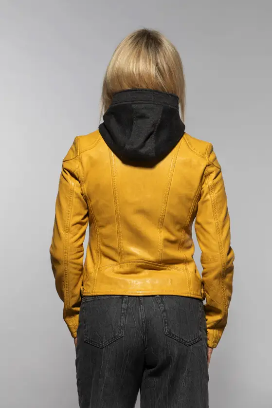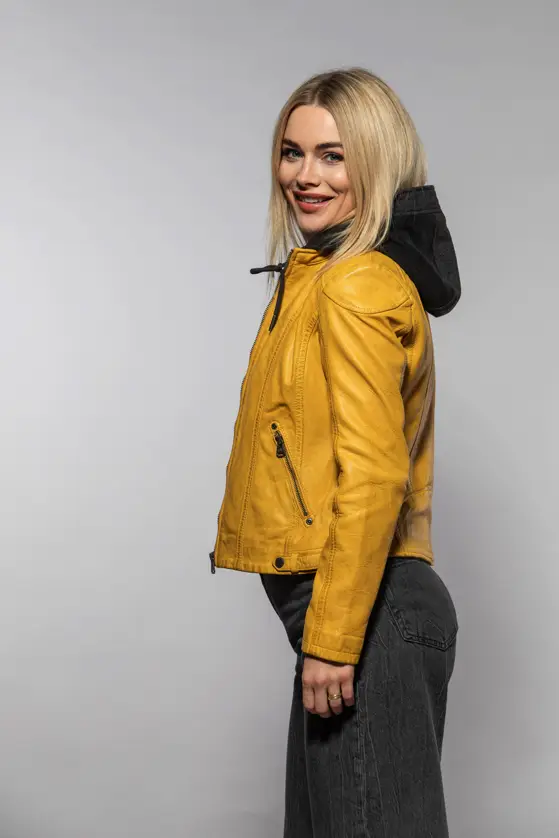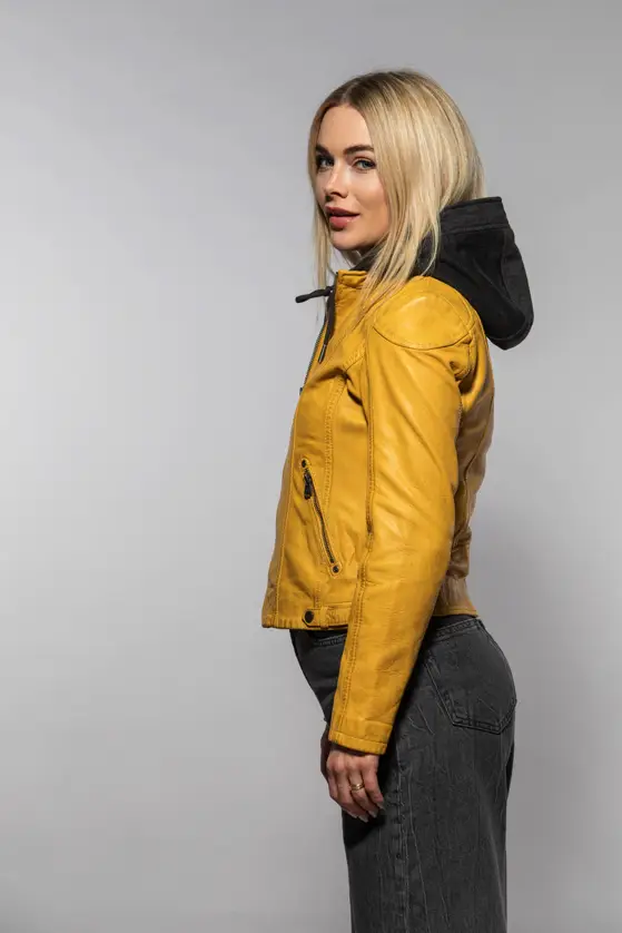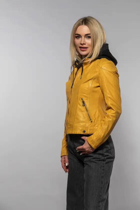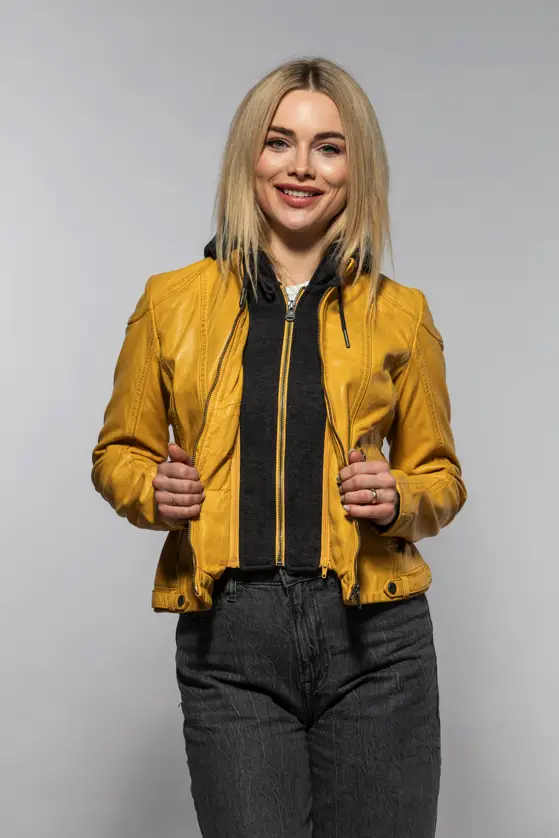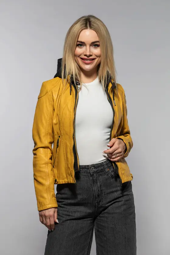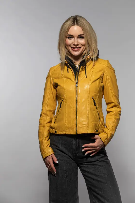 Dámská kožená bunda vyrobená ze 100% jehnětiny, střih Regular dobře padne. Barva Maize je specifický odstín žluté, pojmenovaný podle barvy zralých kukuřičných klasů. Bunda má textilní odepínací kapuci. Jedná se náš originální produkt. Vybíráte koženou bundu? U býka najdete ty nejlepší kožené bundy. Obrovský výběr modelů a barev, bundy máme i v nadměrných velikostech. Navštivte nás v některé z našich prodejen, které máme v Praze, Plzni a v Ostravě. Všechny kožené bundy máme skladem!