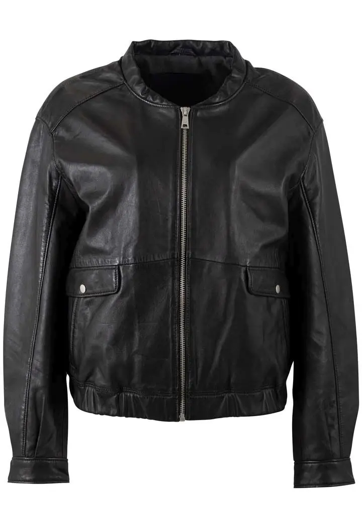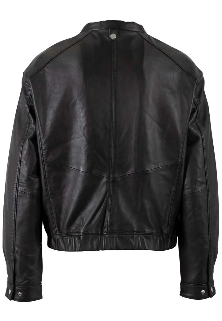Dámská černá kožená bunda ve střihu Oversize (neboli nadměrný střih). Módní styl oblečení navržený tak, aby působil o jednu až dvě velikosti větší, volnější a pohodlnější, než je běžné. Cílem není nosit o dvě čísla větší oblečení, ale záměrně šité volné kousky (trička, mikiny, svetry, saka), které neobepínají postavu. Ideální pro vrstvení, zakrytí partií a ležérní. Oversize móda je vhodná pro různé typy postav, skvěle skryje bříško či zadek a je ideální pro pohodlný, tzv. "comfort" styl.
