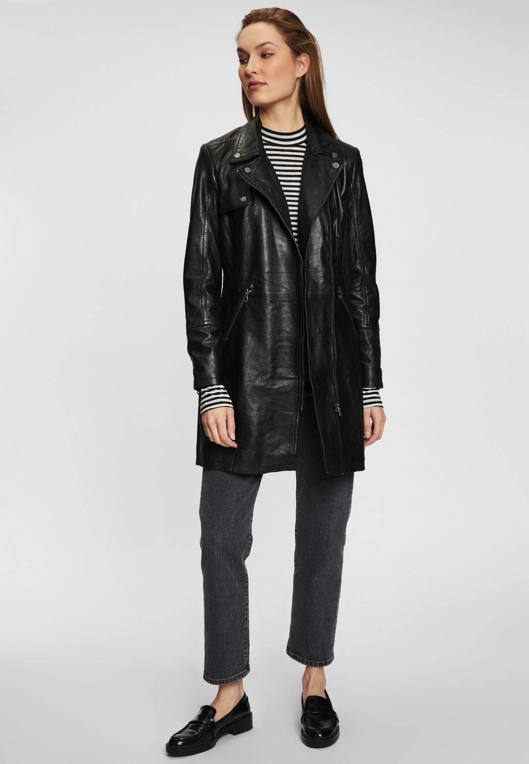 Tento kožený dámský kabát je vyroben ze 100% jehnětiny, střih Regular a sahá do půlky stehen. Vybíráte koženou bundu? U býka najdete kožené bundy předních evropských výrobců Gipsy a Derecraft. Obrovský výběr modelů i barev, bundy máme i v nadměrných velikostech. Navštivte nás v některé z našich prodejen, které máme v Praze, Plzni a v Ostravě. Všechny kožené bundy máme skladem!