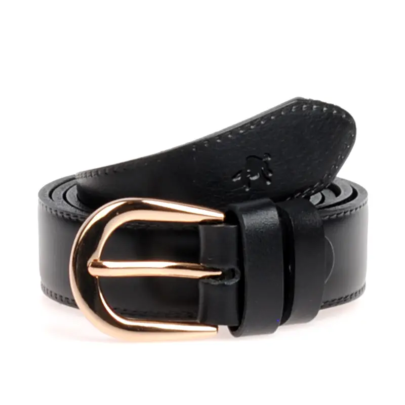 Dámský černý opasek vyrobený z pravé lícové kůže o šíři 30 mm s okrasnou zlatou sponou.