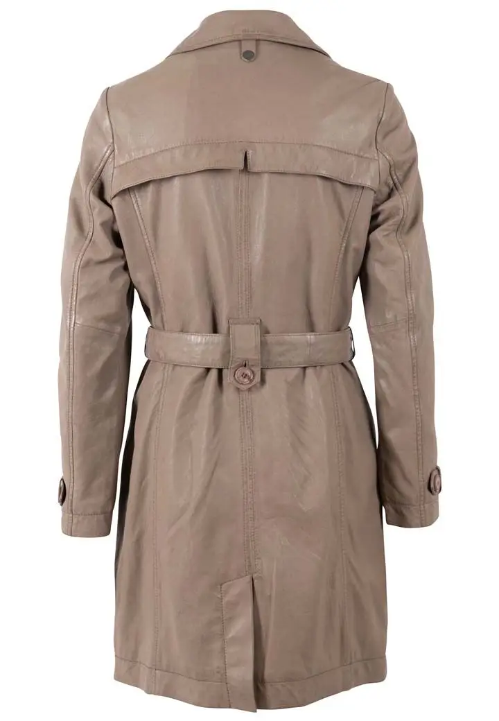 Dámský kožený kabát barvy elephant z jehnětiny, rostlině činěný, podšívka 100% polyester, střih regular. Zapínání je na knoflíky a opasek v pase. Na konci rukávů ozdobné pásky, boční kapsy s knoflíky a zadní rozparek.