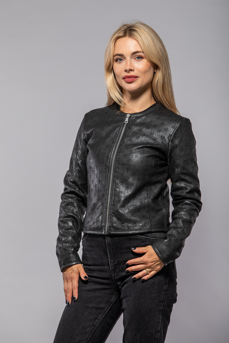 Dámská černá kožená bunda vyrobena ze 100% jehnětiny a je ozdobena perforací ve tvaru květin. Střih je pro běžné postavy Regular-fit. Tato elegantní dámská bunda bude jistě skvělým doplňkem v každém šatníku. Sháníte tak trochu jinou bundu? U býka najdete kožené bundy předních evropských výrobců Mauritius a Deercraft. Obrovský výběr modelů i barev, bundy máme i v nadměrných velikostech. Navštivte nás v některé z našich prodejen, které máme v Praze, Plzni a v Ostravě. Všechny kožené bundy máme skladem!