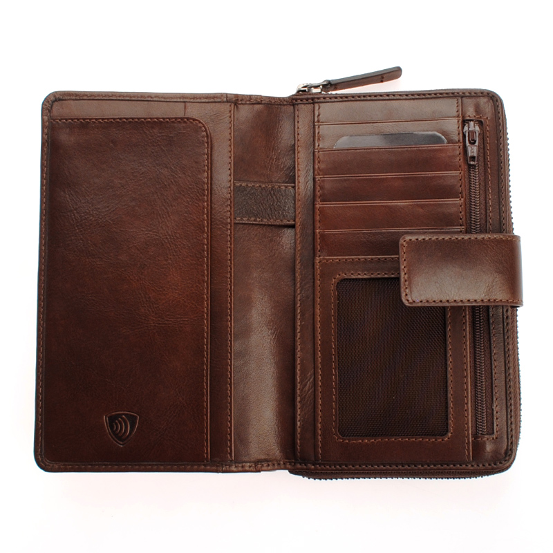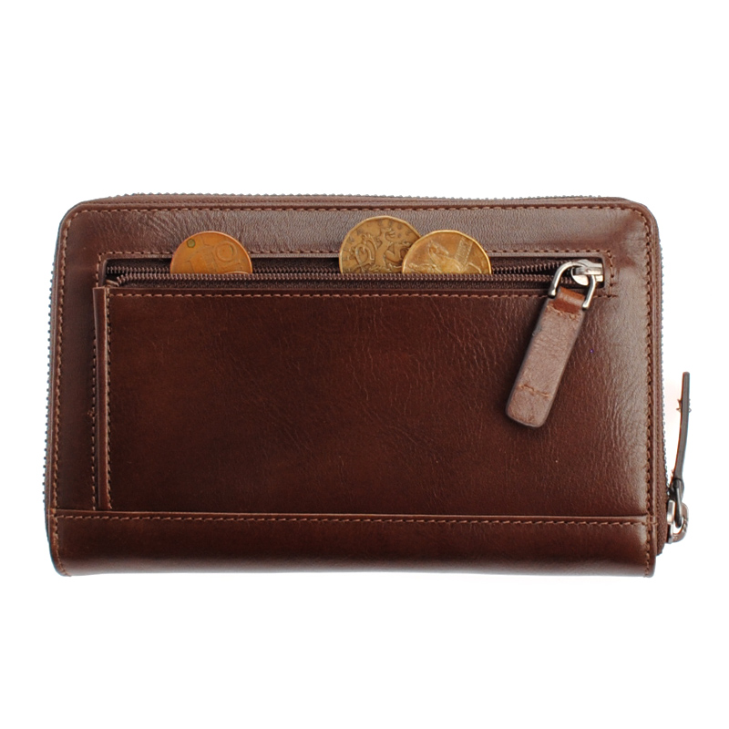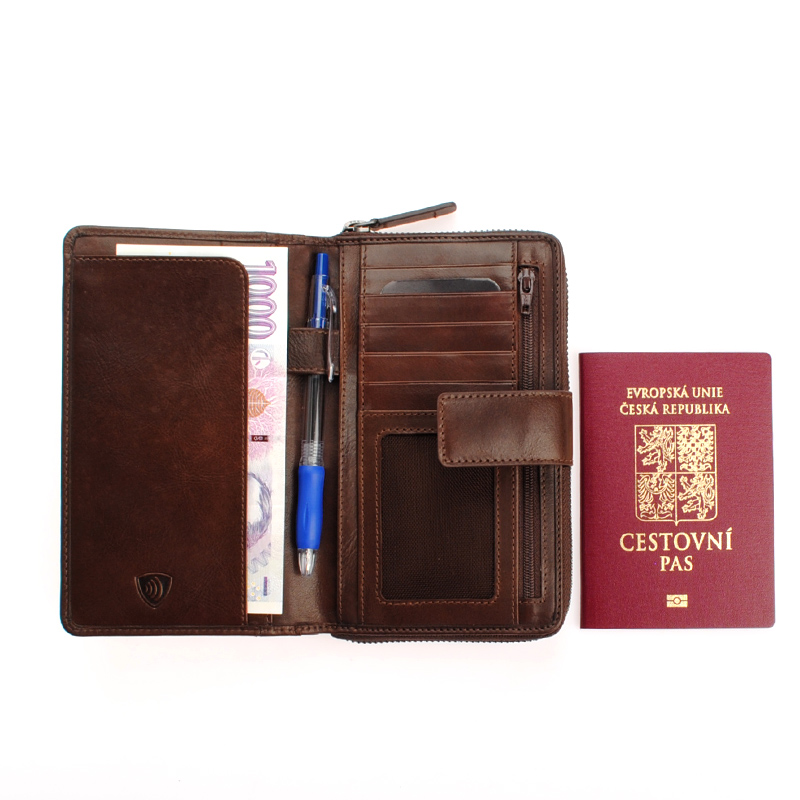 Tato kožená dámská peněženka je vyrobeno ze 100% hovězí lícové kůže. RFID ochrana, kvalitní lícová kůže, 8x přihrádek na bankovky, 4x kapsa na zip, 11. přihrádek na karty, kvalitní podšívka, nitě, druky. Do tohoto pouzdra se vejde i Váš cestovní pas.
