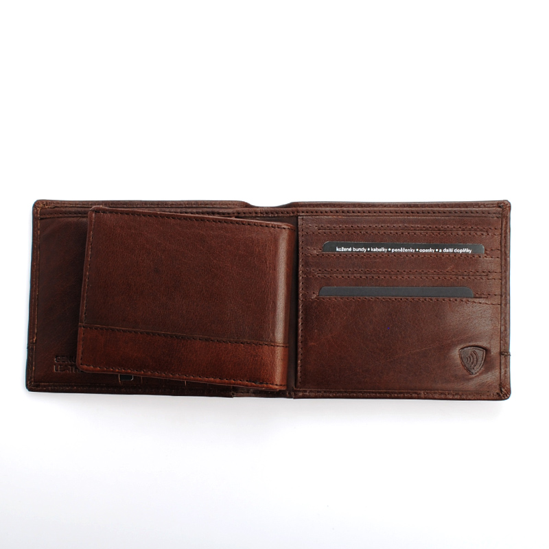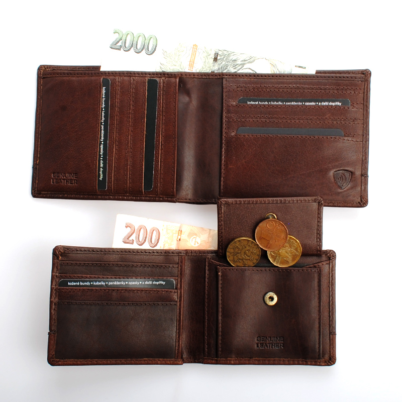 Tato pánská kožená peněženka je vyrobena ze 100%hovězí lícové kůže. RFID ochrana, kvalitní lícová kůže. Peněženka lze rozdělit na dvě peněženky. První větší má rozměry 12,5 x 10,5 x 3cm Do této samostatné peněženky lze vložit 9x karet a má jednu přihrádku na bankovky. Druhá kompaktnější peněženka je vhodná pro uložení nutných věcí a má rozměry 10,5 x 9 x 1,5cm a vložíte do ni 4 karty má také uzavíratelnou kapsu na mince a jednu přihrádku na bankovky.