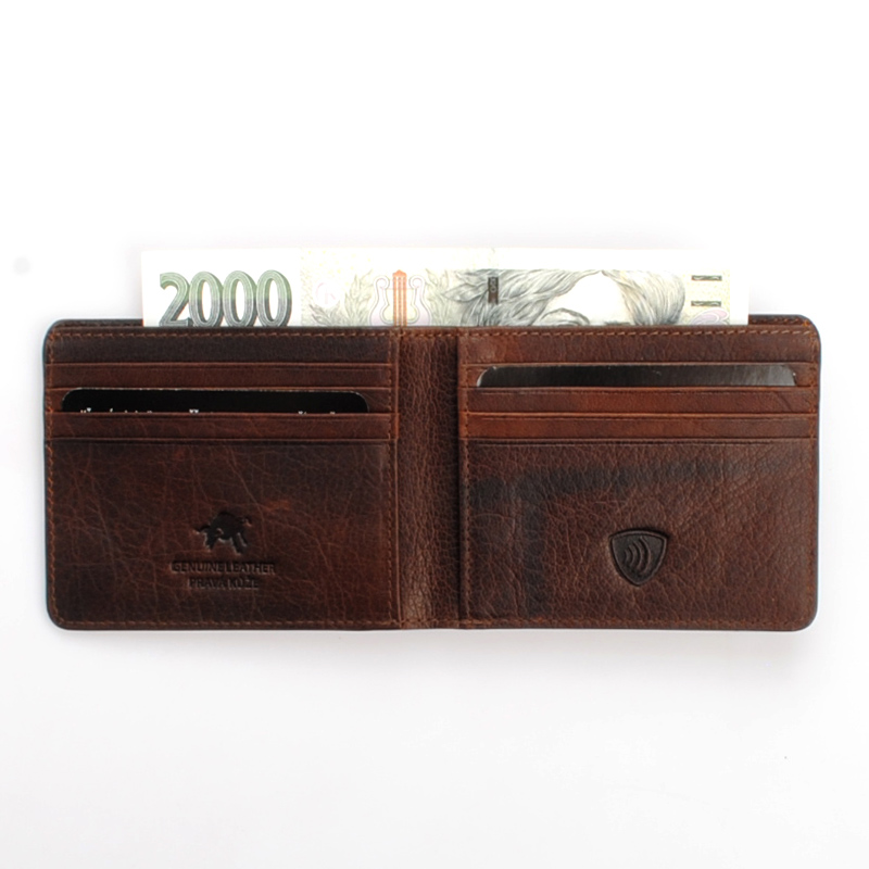 Tato pánská kožená peněženka je vyrobena ze 100%hovězí lícové kůže. RFID ochrana, kvalitní lícová kůže. Peněženka má 2 přihrádky na standardní české bankovky, 8 přihrádek na karty a doklady, kvalitní podšívka, nitě, druky.