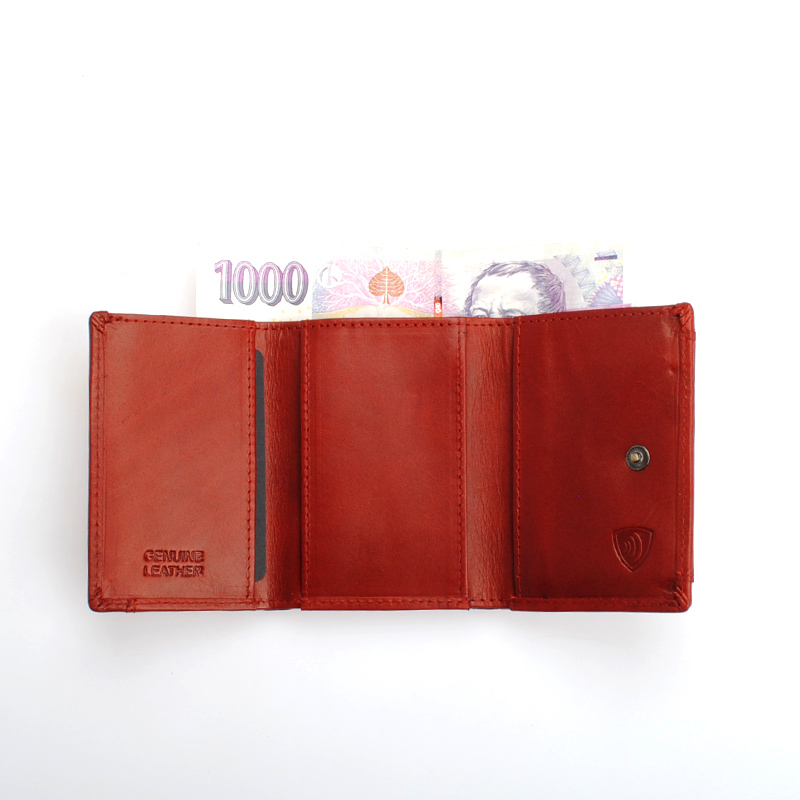Tato malá dámská kožená peněženka je vyrobena ze 100%hovězí lícové kůže. RFID ochrana, kvalitní lícová kůže. Peněženka má přihrádku na standardní české bankovky, kapsičku na mince, 5 přihrádek na karty a doklady, kvalitní podšívka, nitě, druky.