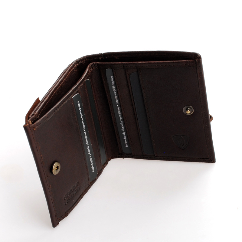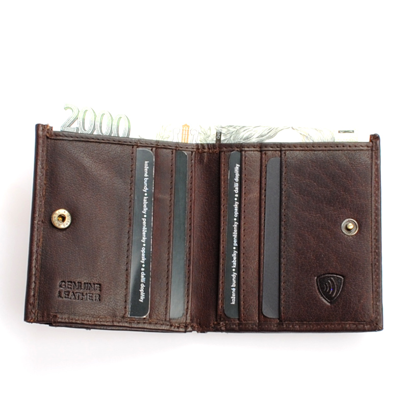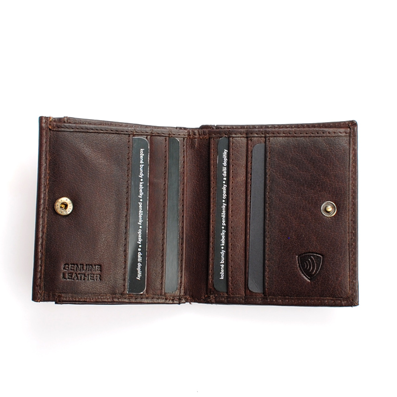 Tato malá kožená peněženka je vyrobena ze 100% hovězí lícové kůže. RFID ochrana, kvalitní lícová kůže. Peněženka má přihrádku na standardní české bankovky, kapsičku na mince, 6 přihrádek na karty a doklady, kvalitní podšívka, nitě, druky.