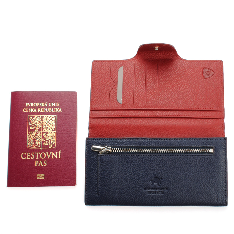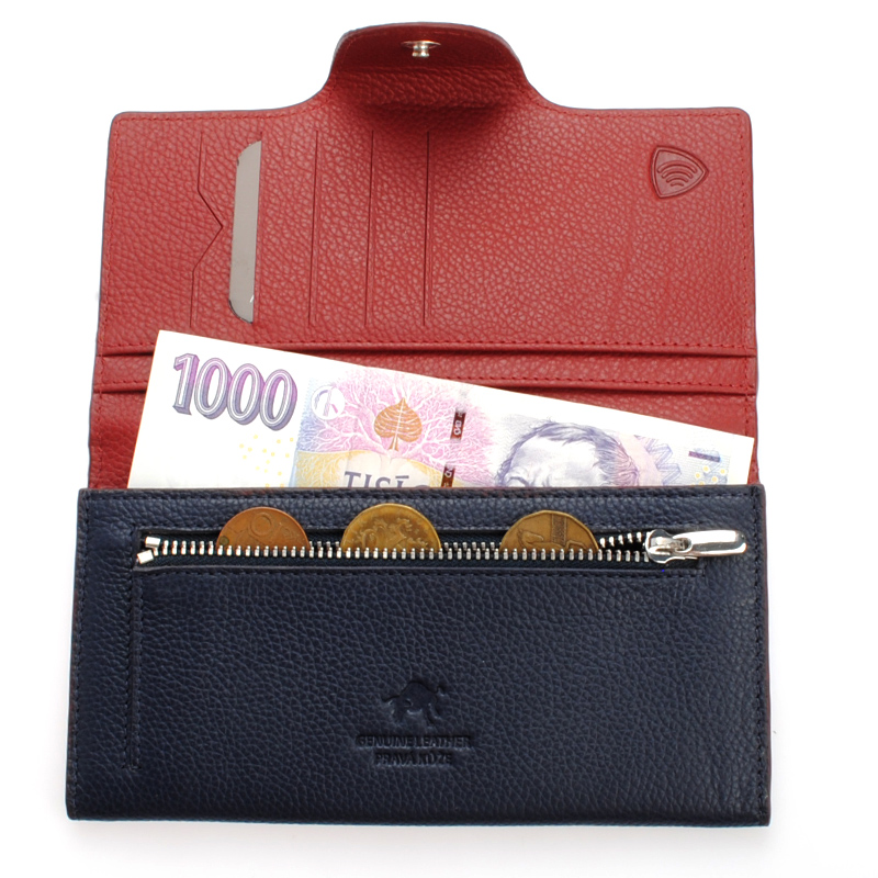 Tato dámská kožená peněženka je vyrobena ze 100%hovězí lícové kůže. RFID ochrana, kvalitní lícová kůže, 4 přihrádky na bankovky, kapsička na mince, 8 přihrádek na karty, kvalitní podšívka, nitě, druky. Do této peněženky se vejde i Váš cestovní pas.