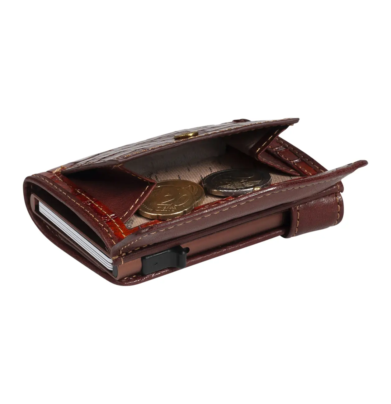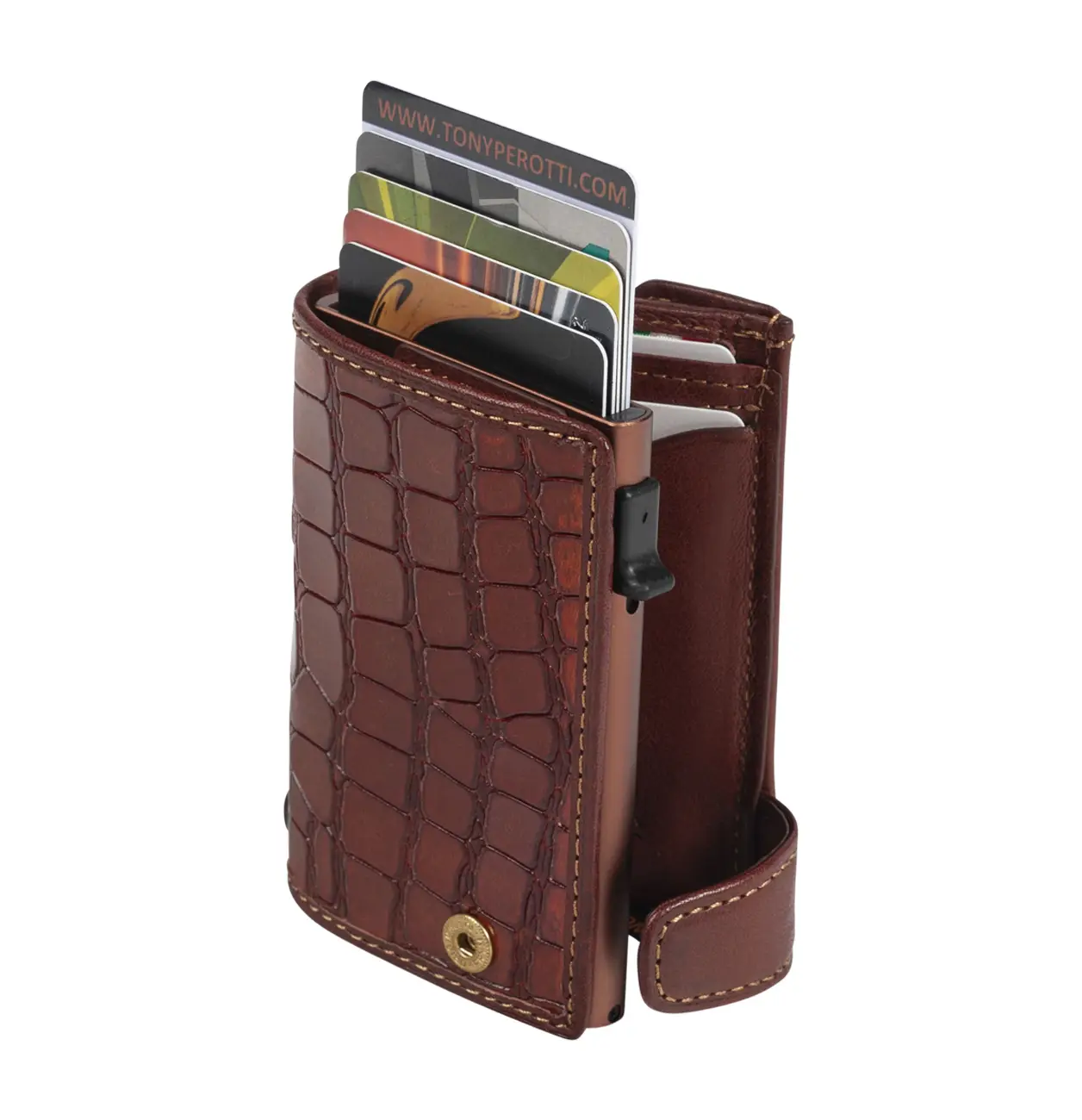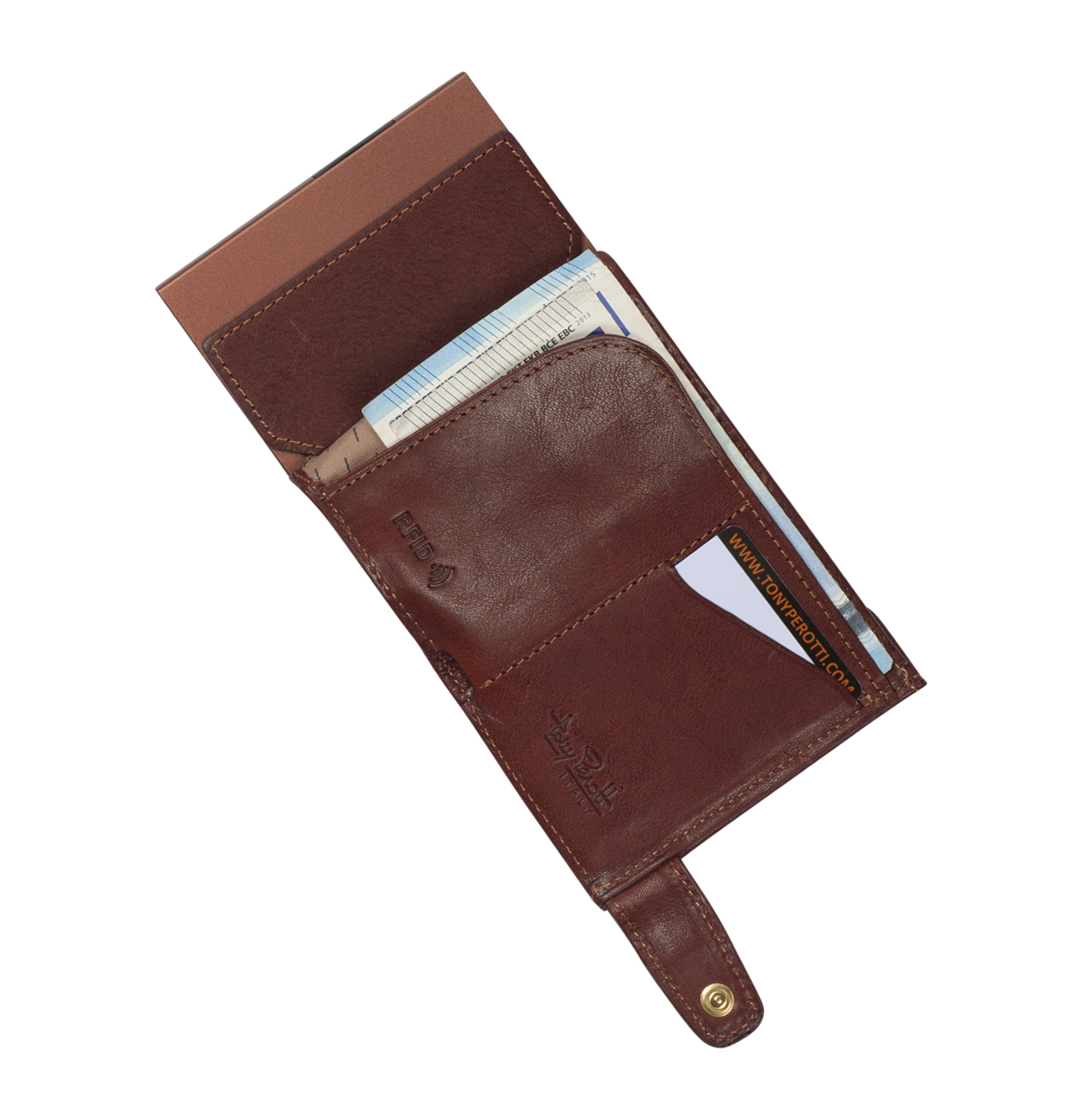 Tato kompaktní peněženka Tony Perotti je vyrobena z přírodní kůže. Peněženka má úložný prostor pro bankovky, mince, sloty pro kreditní karty a navíc hliníkový držák do kterého lze vložit 6 karet. Celá peněženka je chráněna RFID ochranou, která zabraňuje neoprávněnému přístupu k bezkontaktním kartám.