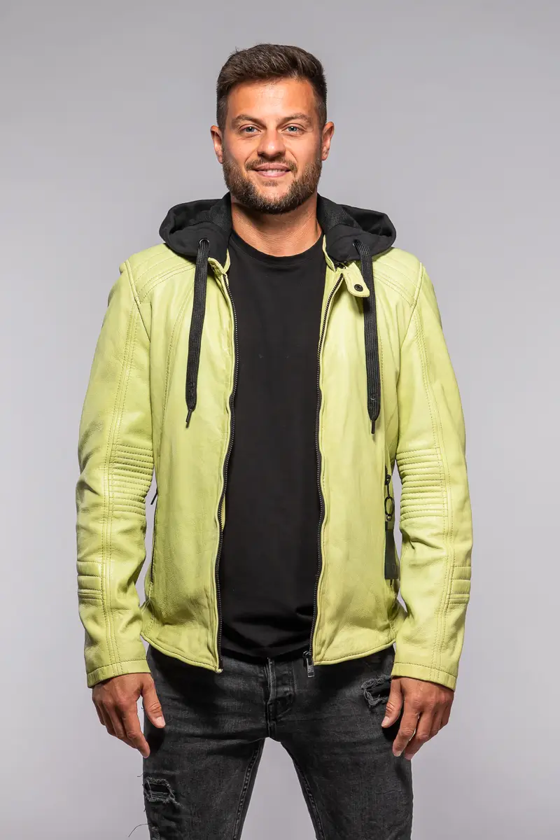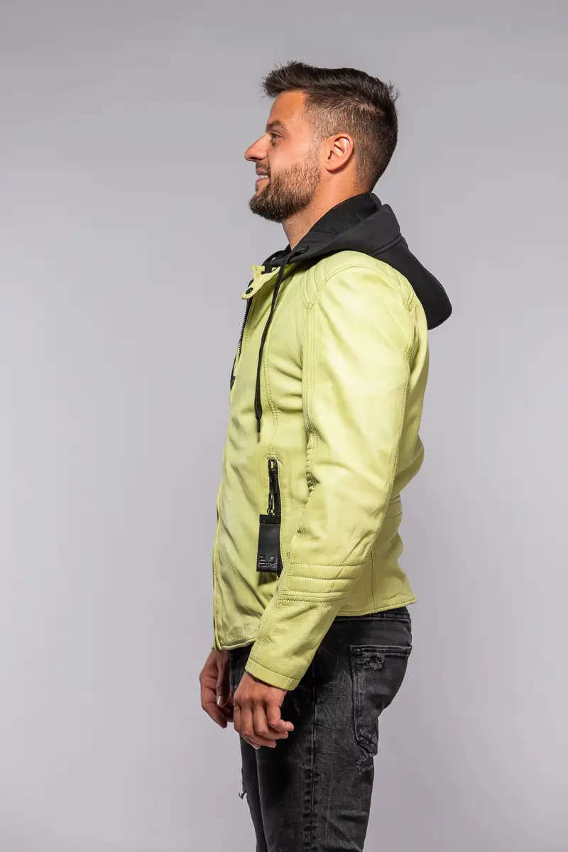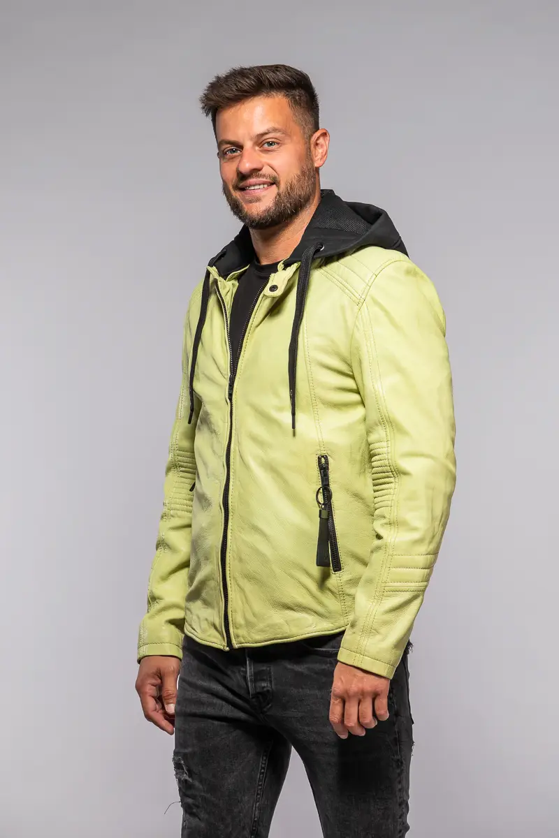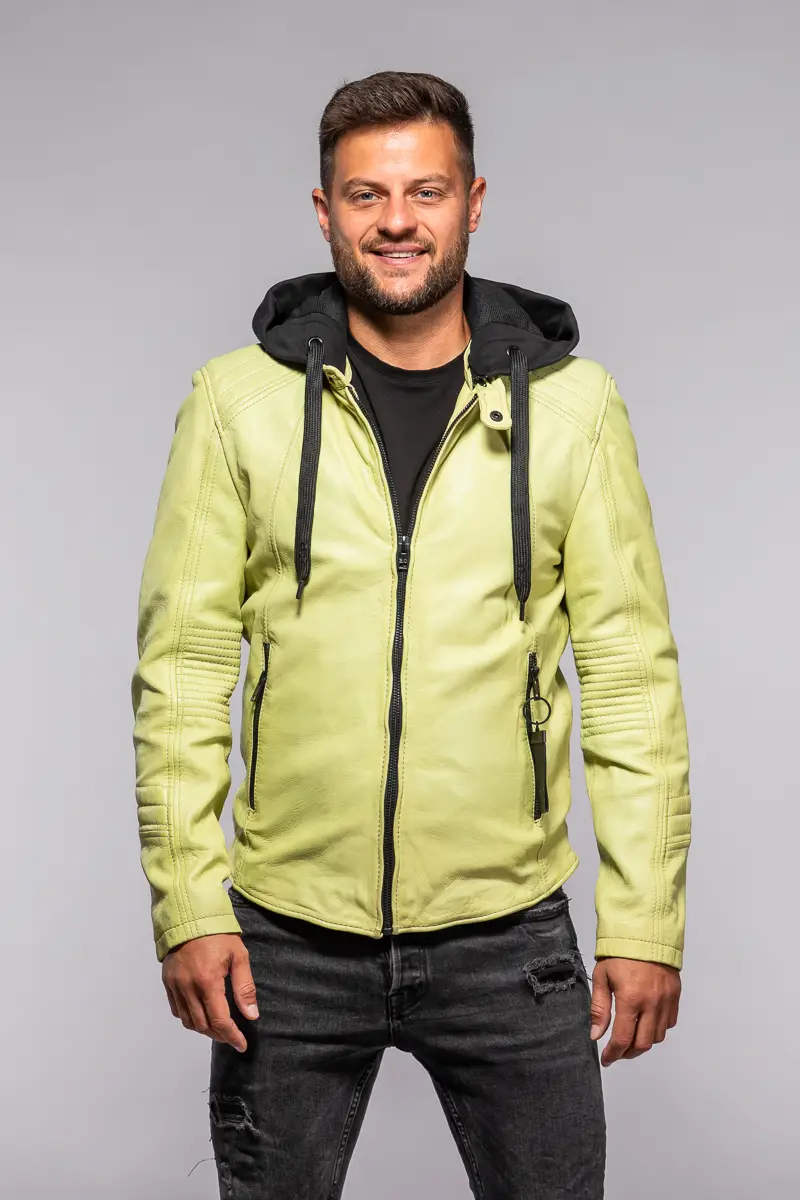 Pánská kožená bunda v barvě Lime je vyrobena ze 100% jehnětiny, zdobená prošitím na rukávech a ramenou s odnímatelnou textilní kapucí. Střih Slim, který skvěle sedí vyšším štíhlým postavám.