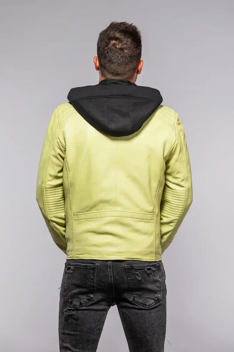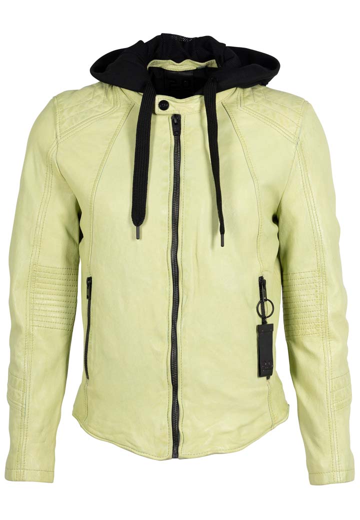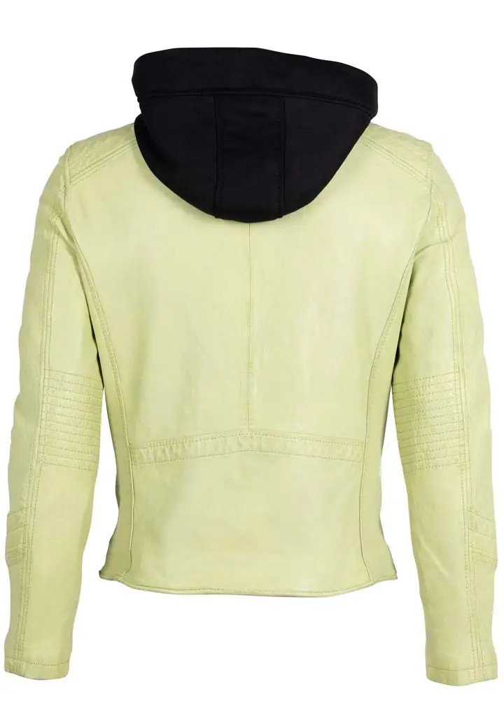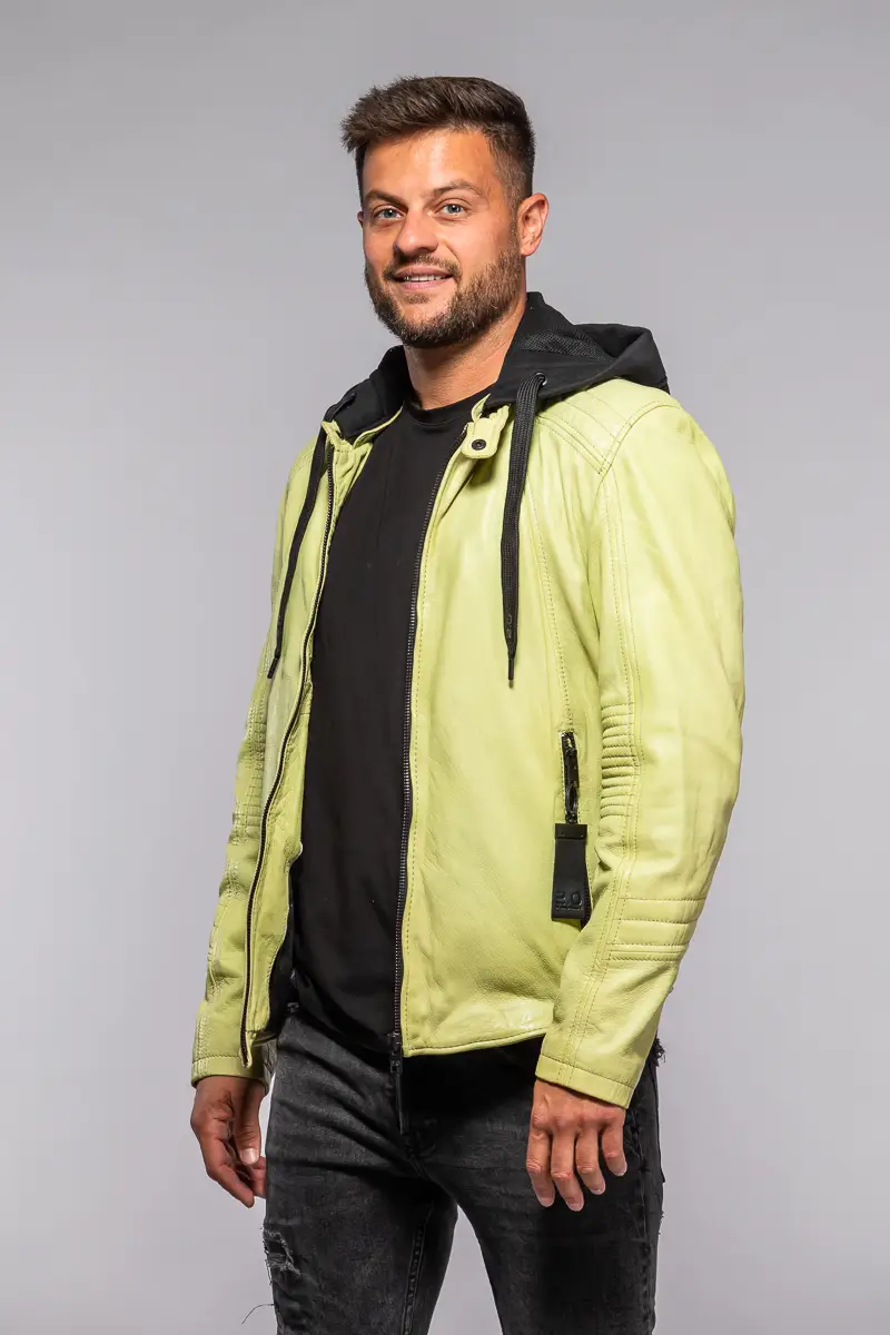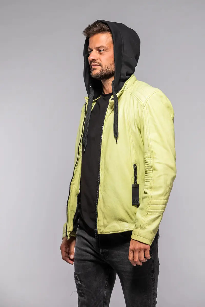 Pánská kožená bunda v barvě Lime je vyrobena ze 100% jehnětiny, zdobená prošitím na rukávech a ramenou s odnímatelnou textilní kapucí. Střih Slim, který skvěle sedí vyšším štíhlým postavám.