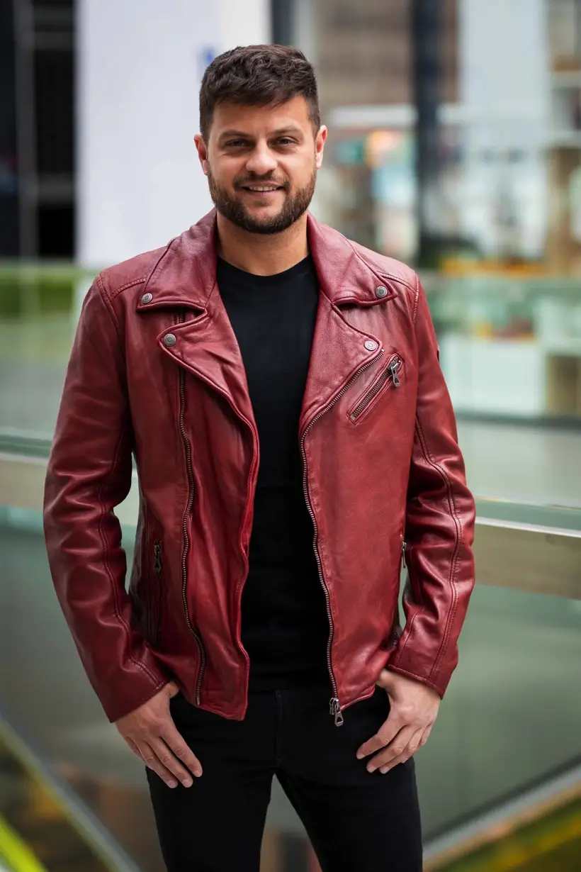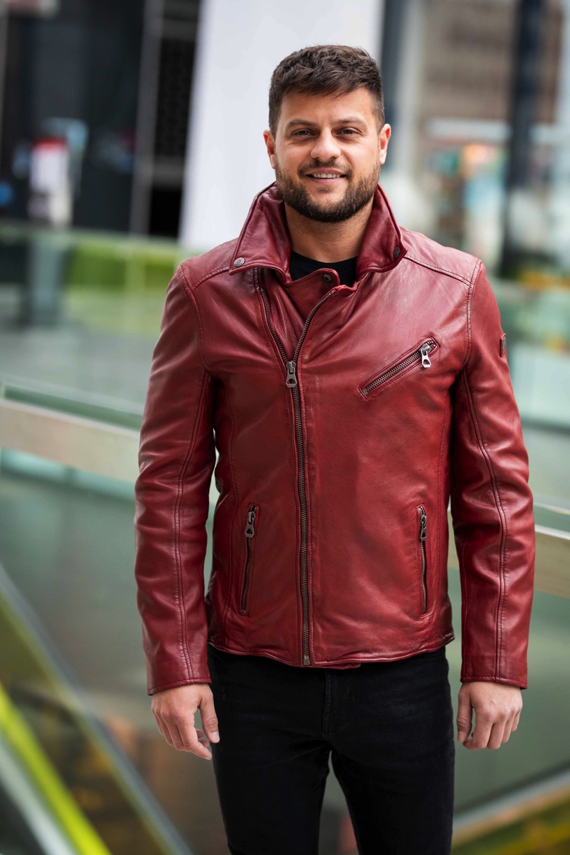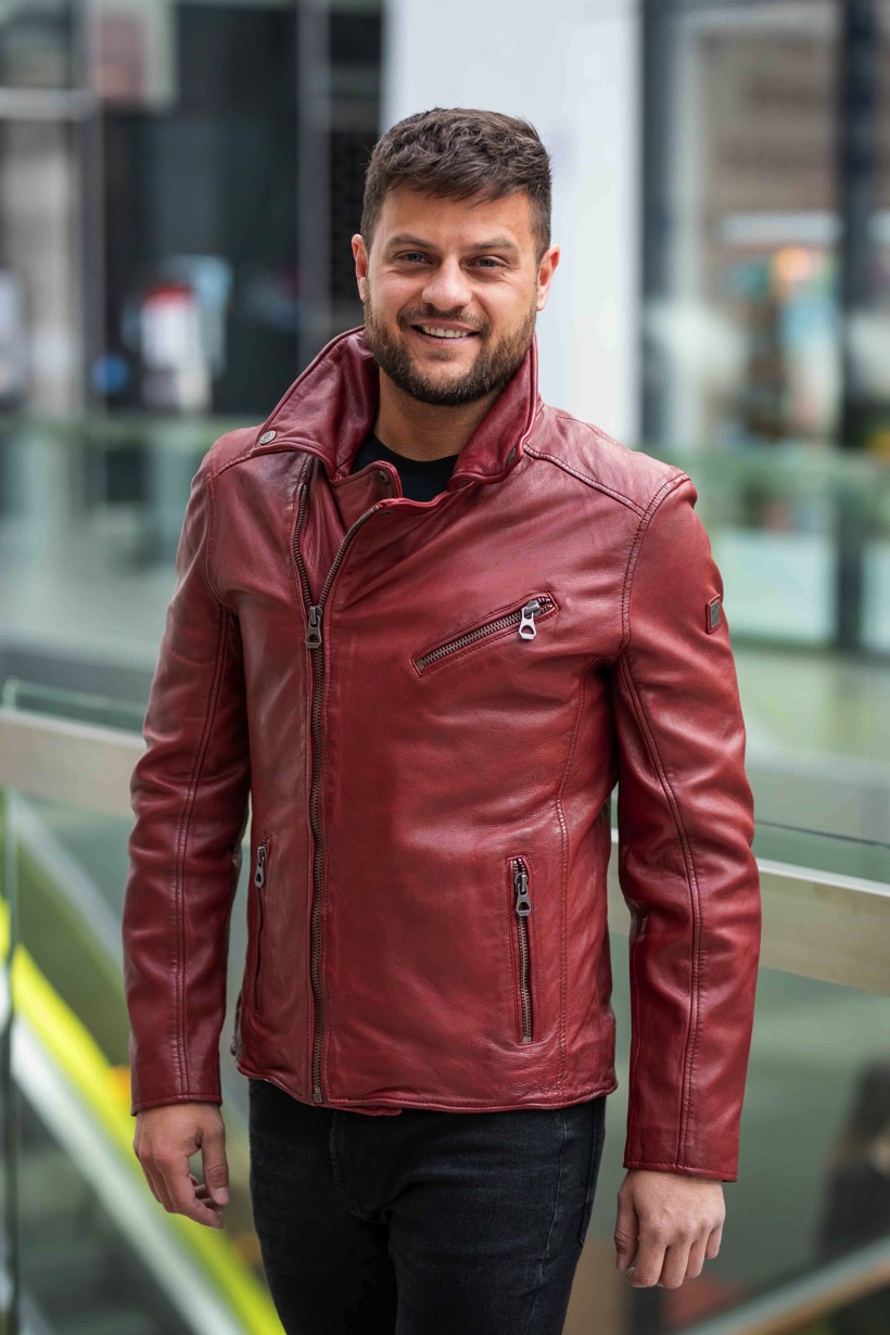 Moderní pánský červený kožený křivák. Střih Regular velmi pěkně sedí. Vybíráte koženou bundu? U býka najdete kožené bundy předních evropských výrobců Gipsy a Deercraft. Obrovský výběr modelů i barev, bundy máme i v nadměrných velikostech. Navštivte nás v některé z našich prodejen, které máme v Praze, Plzni a v Ostravě. Všechny kožené bundy máme skladem!