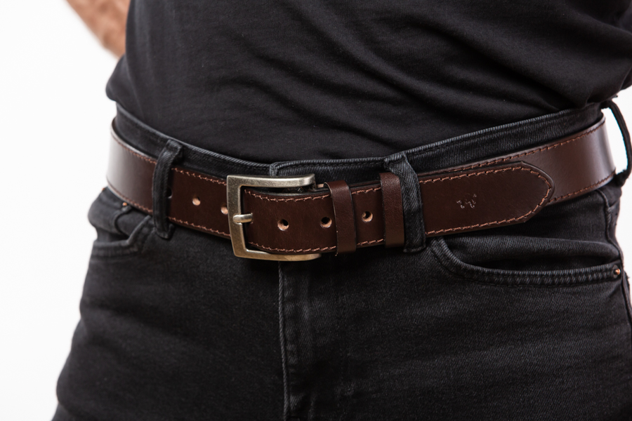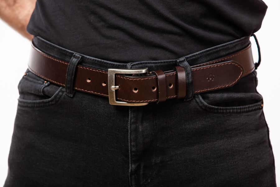 Pánský hnědý opasek vyrobený z pravé lícové kůže o šíři 40 mm.