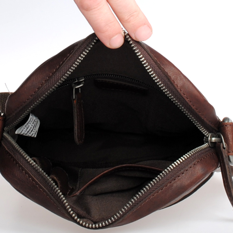Tato praktická kožená taška značky naší výroby je vyrobena z prvotřídních materiálů. Je vhodná ke každodennímu použití. Hlavní přihrádka je uzavíratelná na zip. Uvnitř se skrývají poutka na pera a další přihrádka na zip. Toto crossbody je vybaveno nastavitelným textilním ramenním popruhem.