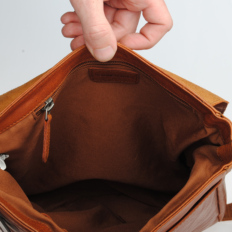 Tato praktická kožená taška značky naší výroby je vyrobena z prvotřídních materiálů. Je vhodná ke každodennímu použití. Hlavní přihrádka je uzavíratelná na zip. Uvnitř se skrývají poutka na pera a další přihrádka na zip. Toto crossbody je vybaveno nastavitelným textilním ramenním popruhem.