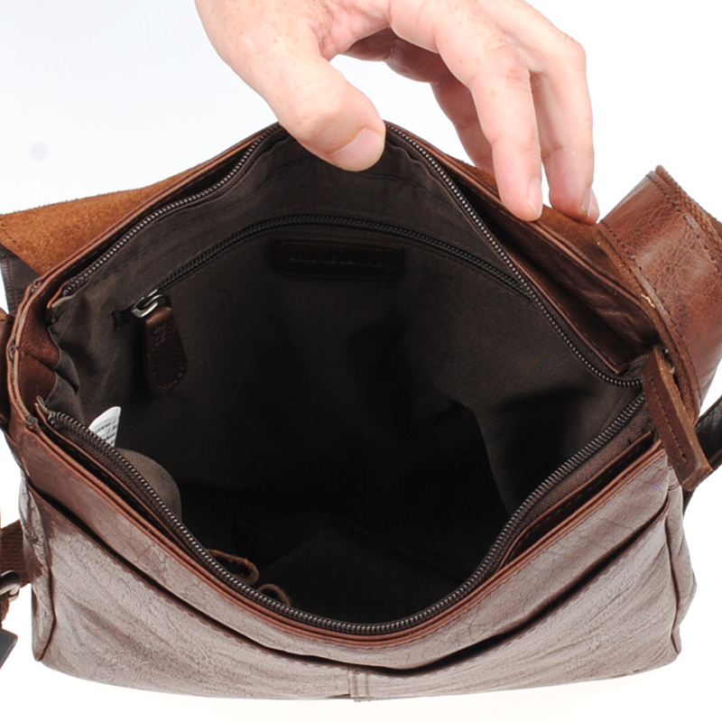 Tato praktická kožená taška značky naší výroby je vyrobena z prvotřídních materiálů. Je vhodná ke každodennímu použití. Hlavní přihrádka je uzavíratelná na zip. Uvnitř se skrývají poutka na pera a další přihrádka na zip. Toto crossbody je vybaveno nastavitelným textilním ramenním popruhem.