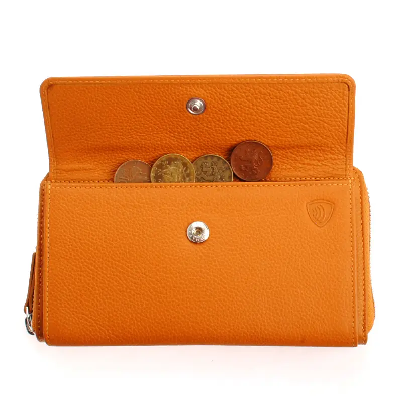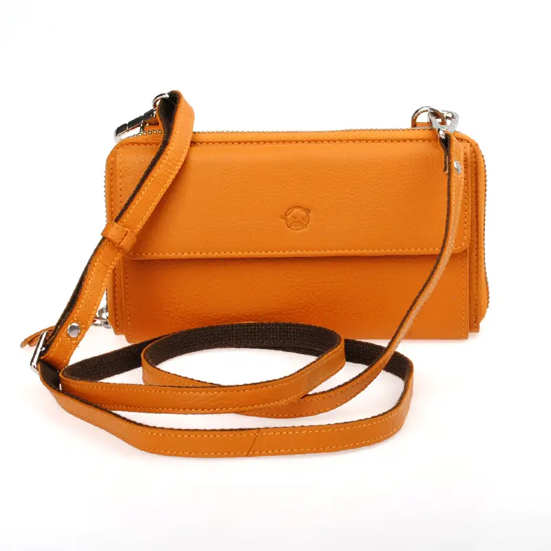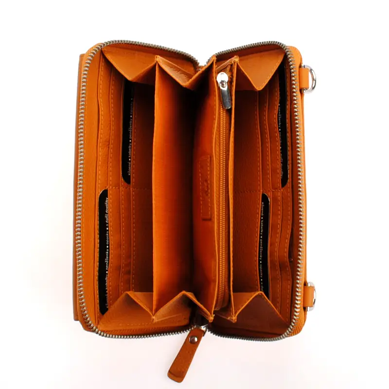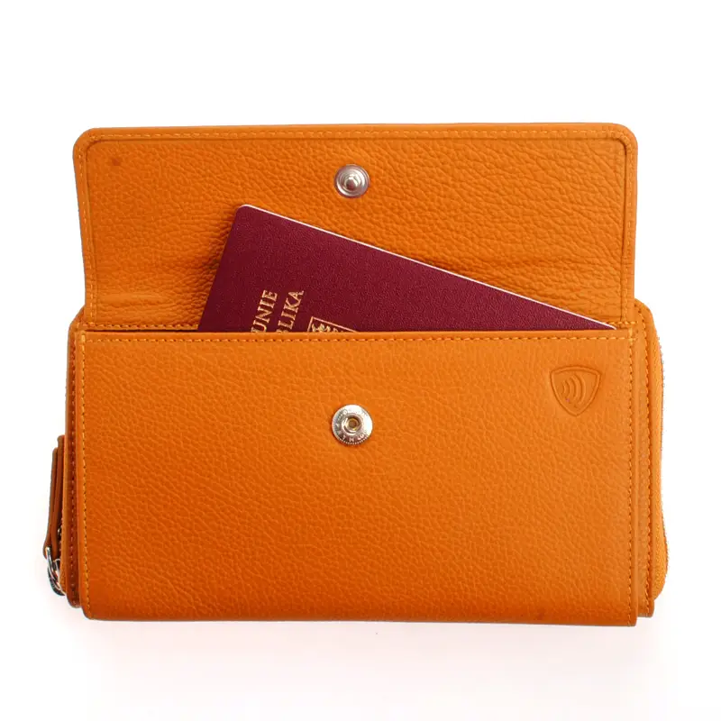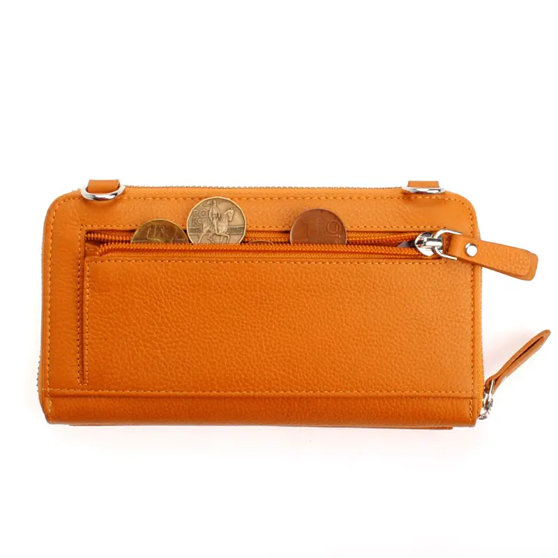 Tato kožená dámská peněženka je vyrobeno ze 100% hovězí lícové kůže. RFID ochrana, kvalitní lícová kůže, 5 přihrádek na bankovky, 3x kapsa na zip, 16 přihrádek na karty, kvalitní podšívka, nitě, druky. Do tohoto pouzdra se vejde i Váš cestovní pas. Popruh je nastavitelný o délce 120 cm. Do velké čelní kapsy můžete vložit váš mobil a díky odnímatelnému dlouhému popruhu můžete tuto peněženku nosit jako malou kabelku.
